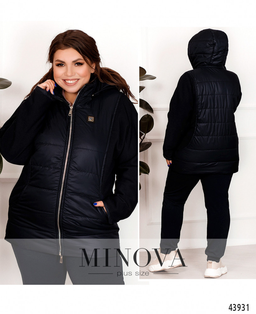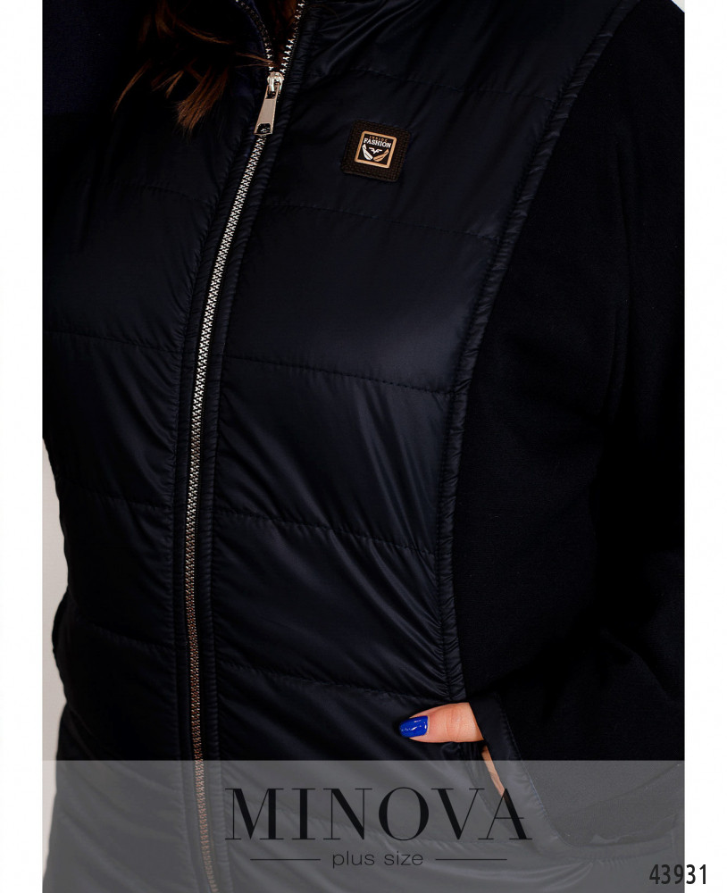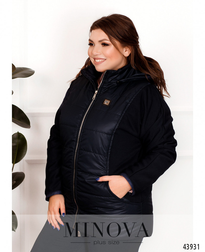 Стильная куртка батал с капюшоном, капюшон отстёгивается. Рукава покроя "кимоно", из мягкой ткани, основная часть - из простёганной ткани. Застёжка - молния спереди по центру, на груди декоративная нашивка. По бокам - карманы (между простёганной и мягкой тканью).