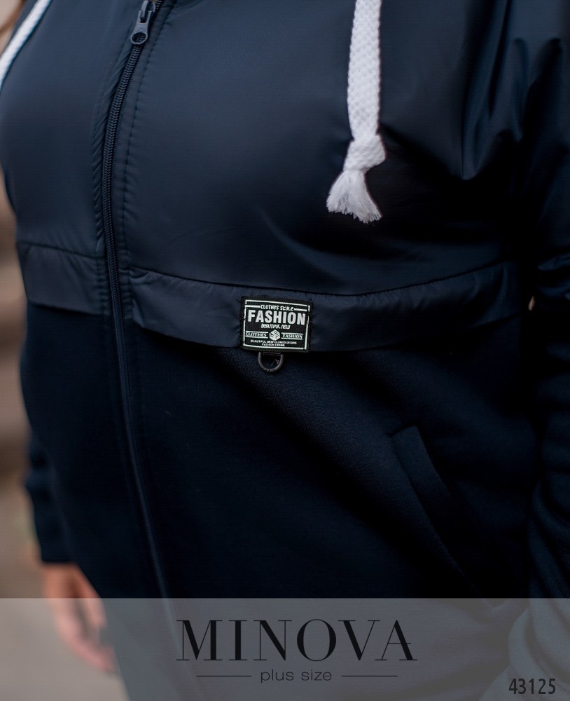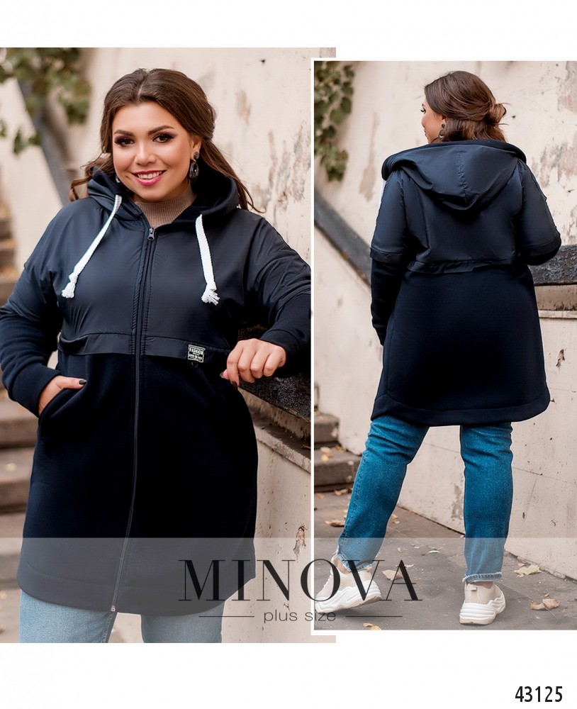 Удобная куртка батал с двуслойной верхней частью и мягкой однослойной тканью на нижней части. По бокам врезные карманы. В наличии капюшон с пропущенными через него шнурками, с мягкой оторочкой. Рукава с манжетами, подшиты к верхней части. На груди декоративная нашивка.