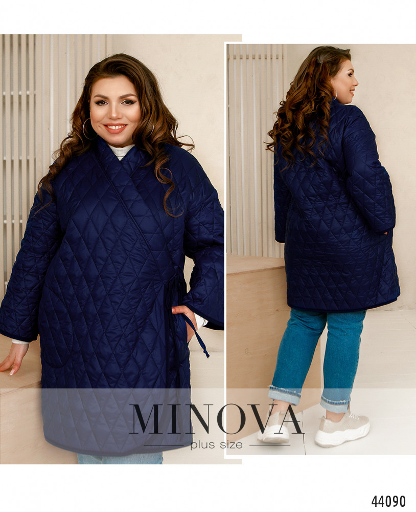 Стильная куртка батал без подкладки, из простёганной плотной ткани. По бокам - карманы в шве, с простёганным контуром. Завязывается на ленты на запАх снаружи и изнутри. Рукава без манжет.