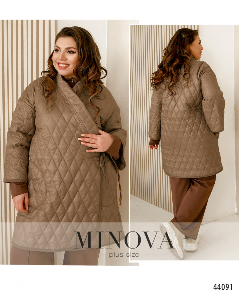 Стильная куртка батал без подкладки, из простёганной плотной ткани. По бокам - карманы в шве, с простёганным контуром. Завязывается на ленты на запАх снаружи и изнутри. Рукава без манжет.