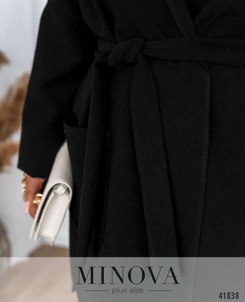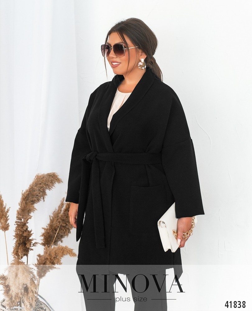Мягкое пальто-кардиган батал без застёжек, с поясом. По бокам - накладные карманы. Подол асимметричный, по спинке длиннее, спереди короче. Рукава без манжет. Подкладки нет.