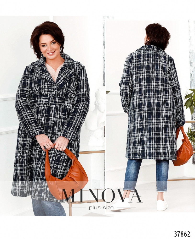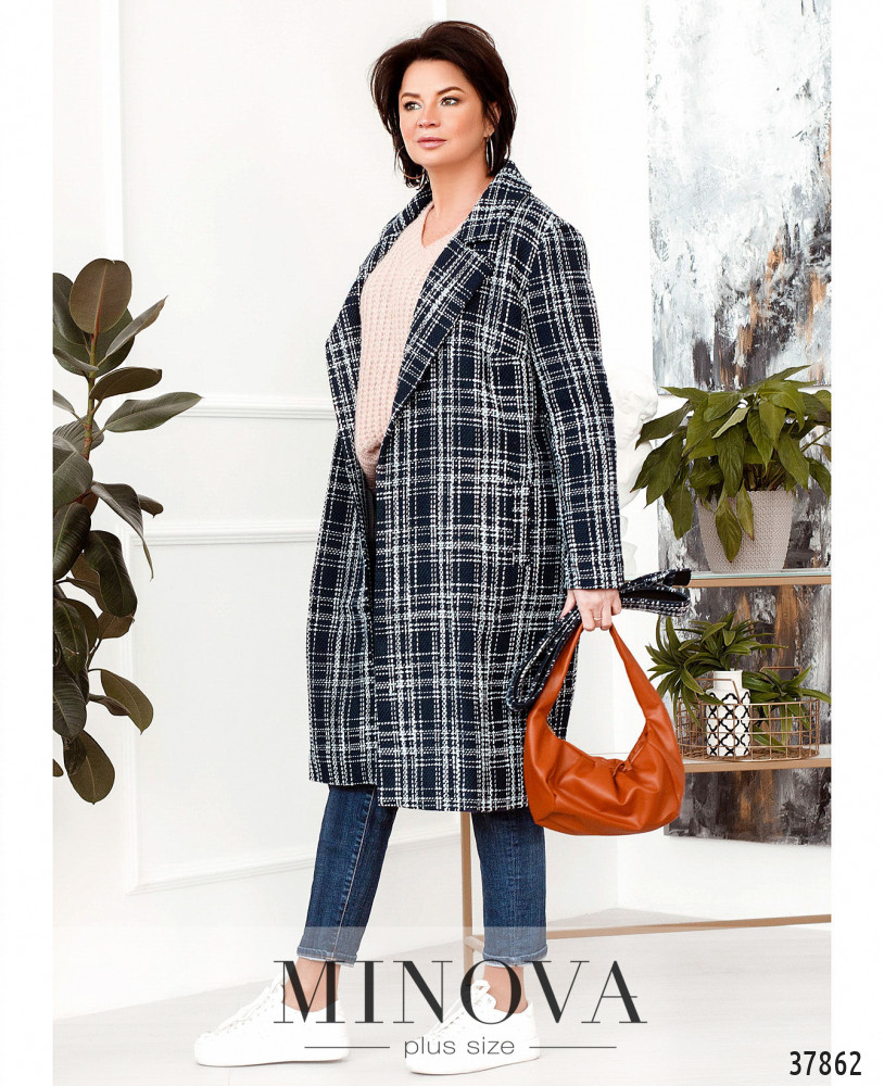 Привлекательное пальто большого размера без застёжек, рукава без манжет, с подкладкой, по бокам - карманы в шве.