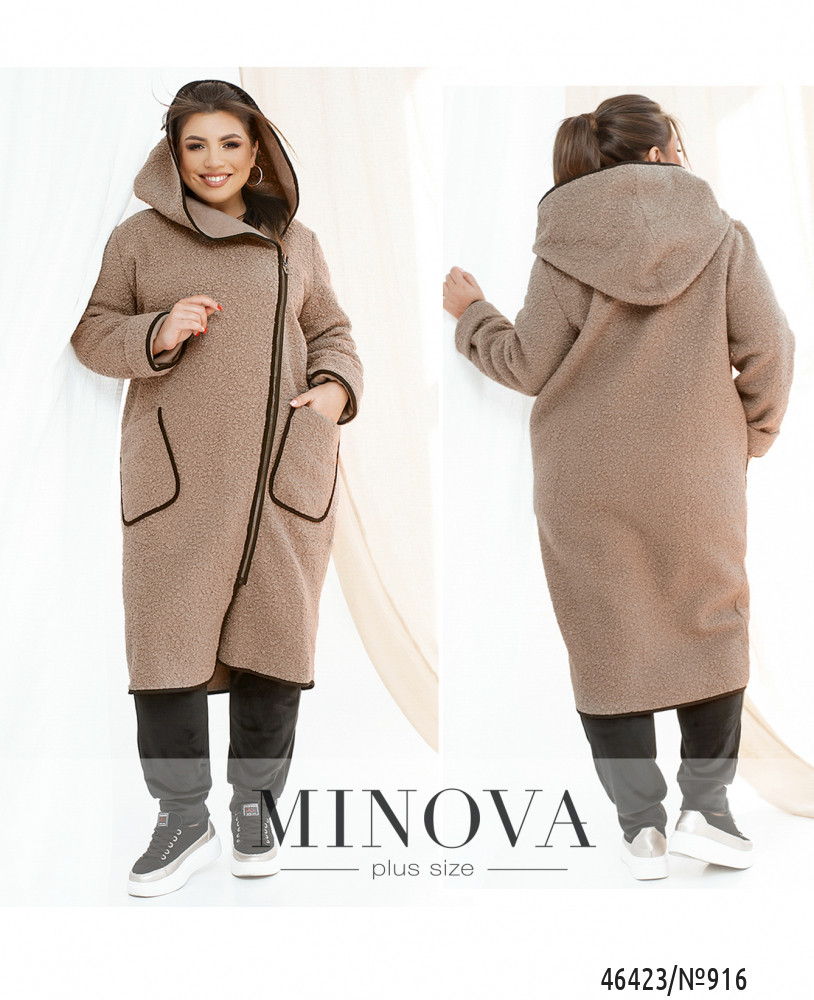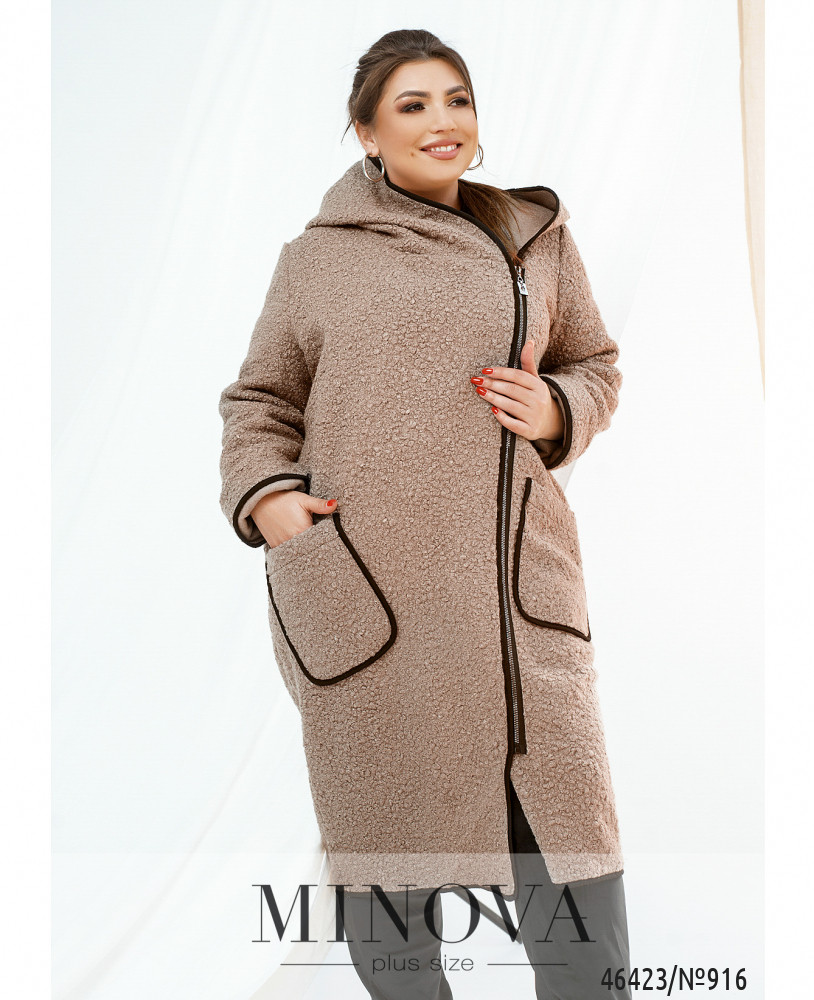 Оригинальное пальто большого размера с капюшоном и двумя накладными карманами, застёгивается на диагональную молнию. Рукава без манжет, подкладки нет.