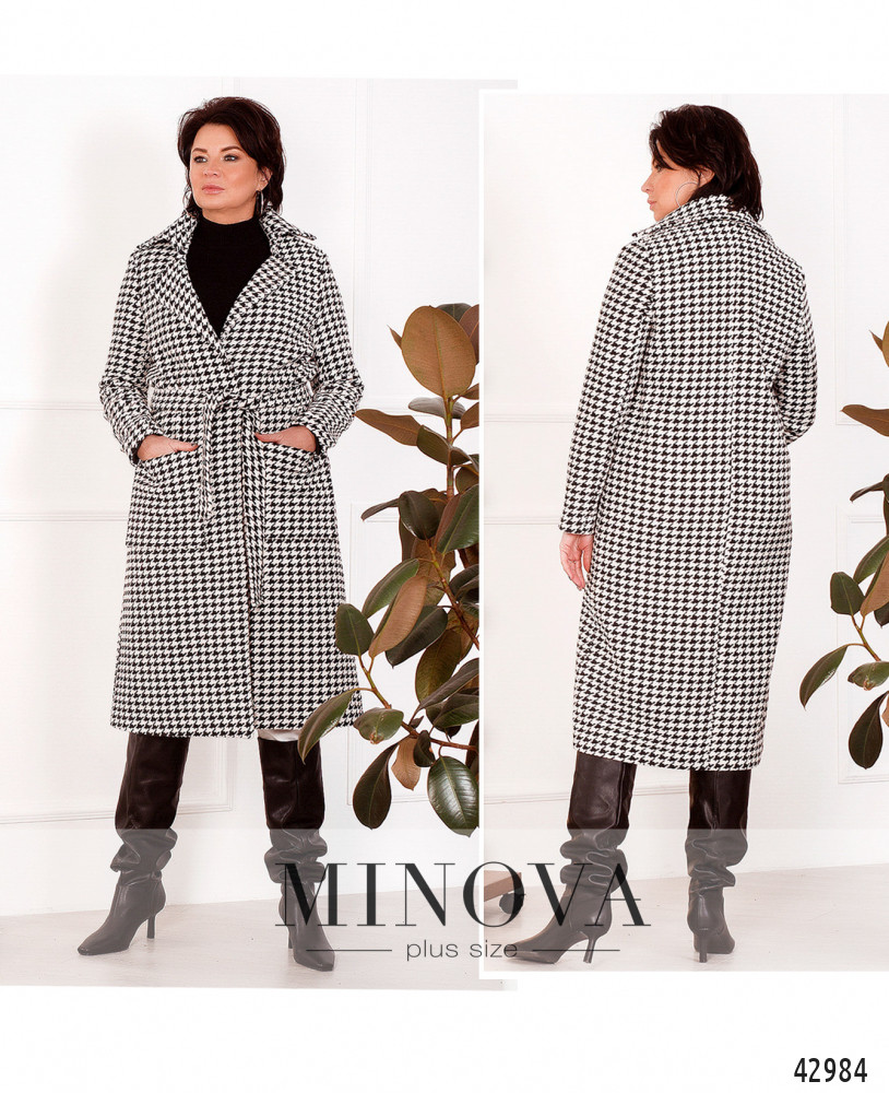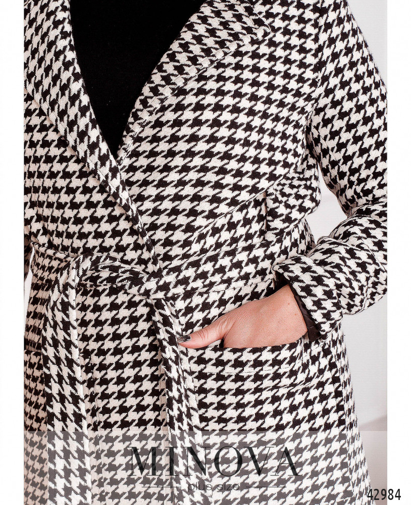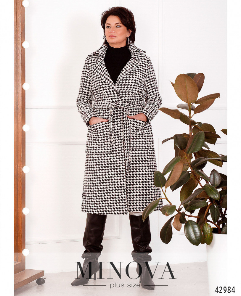 Элегантное пальто батал с подкладкой, без застёжек, по бокам - накладные карманы. В комплекте пояс. Лацканы резные.