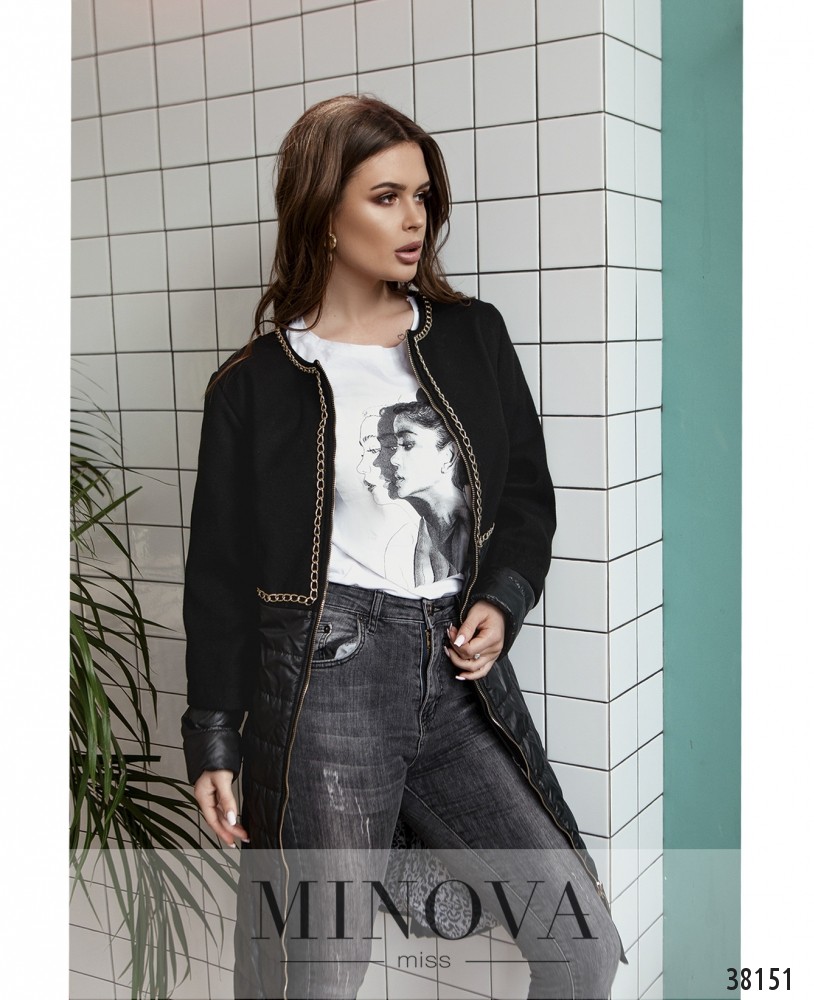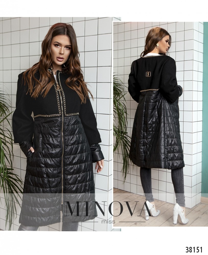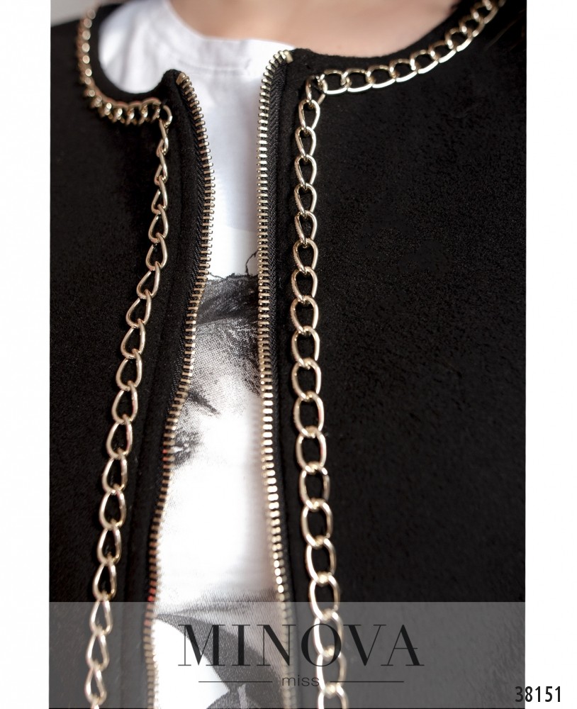Оригинальное и нарядное тёплое пальто, подол из простёганной ткани, из такой же ткани – рукав до плеча. Сверху мягкая ткань, верхний рукав накладывается на нижний. Декорировано цепочками, застёгивается на молнию по центру. Изнутри – подкладка анималистичной расцветки, такая же – изнутри врезных карманов, расположенных по бокам. По спинке также украшено цепочкой и декоративной нашивкой. Украшение входит в комплект.