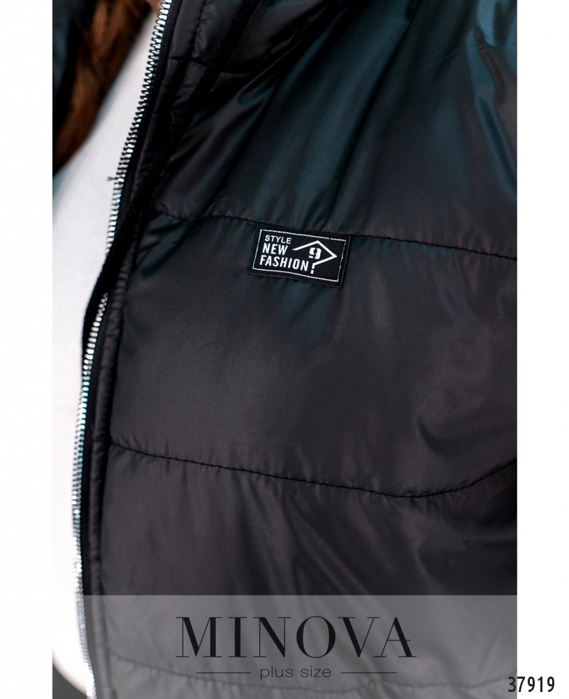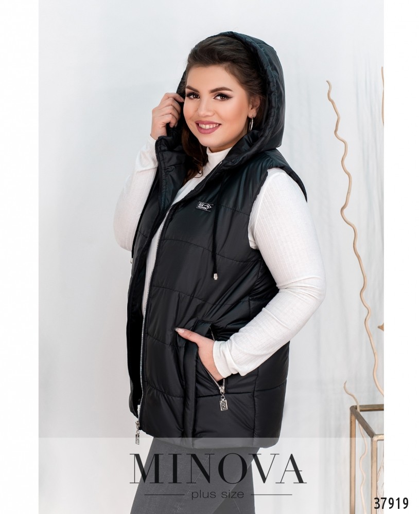 Стильная простёганная жилетка батал с капюшоном и врезными карманами по бокам. На левой стороне груди – небольшая декоративная нашивка. Застёгивается на молнию, расположенную по центру. С подкладкой.