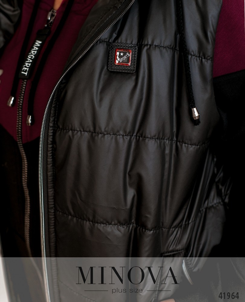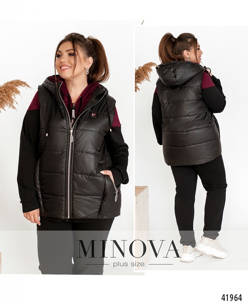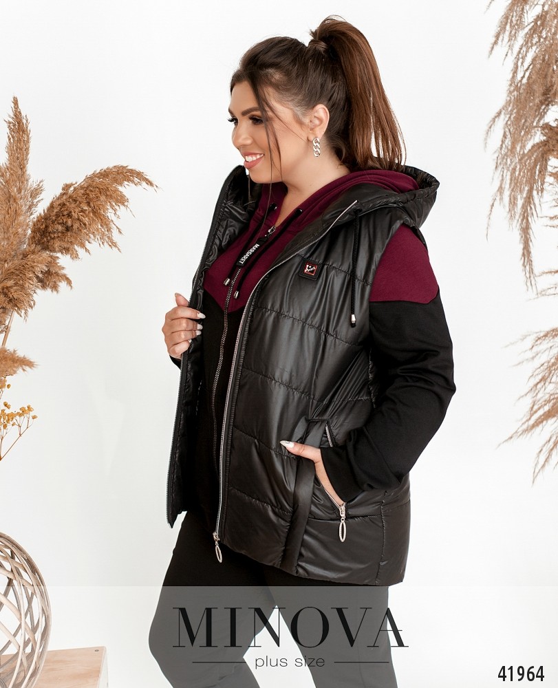 Стильный и удобный простёганый жилет батал с подкладкой и капюшоном. Через капюшон пропущен шнурок. По бокам - врезные карманы с молниями. Застёгивается на молнию по центру.