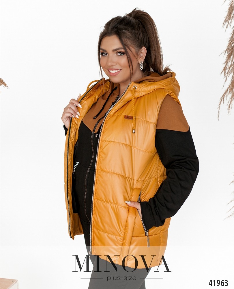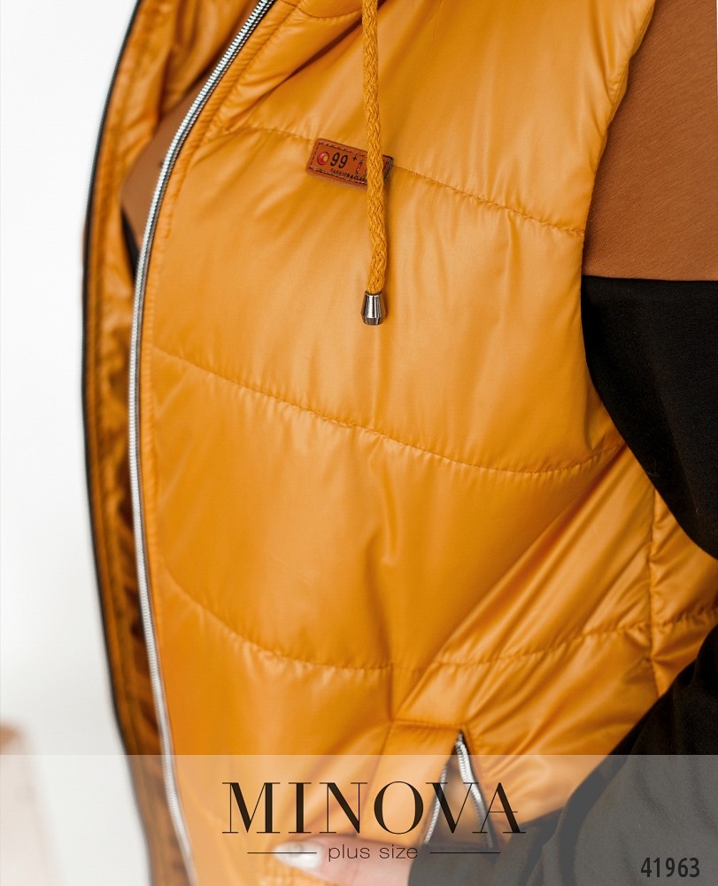 Стильный и удобный простёганый жилет батал с подкладкой и капюшоном. Через капюшон пропущен шнурок. По бокам - врезные карманы с молниями. Застёгивается на молнию по центру.