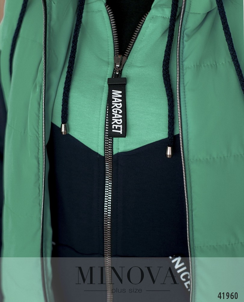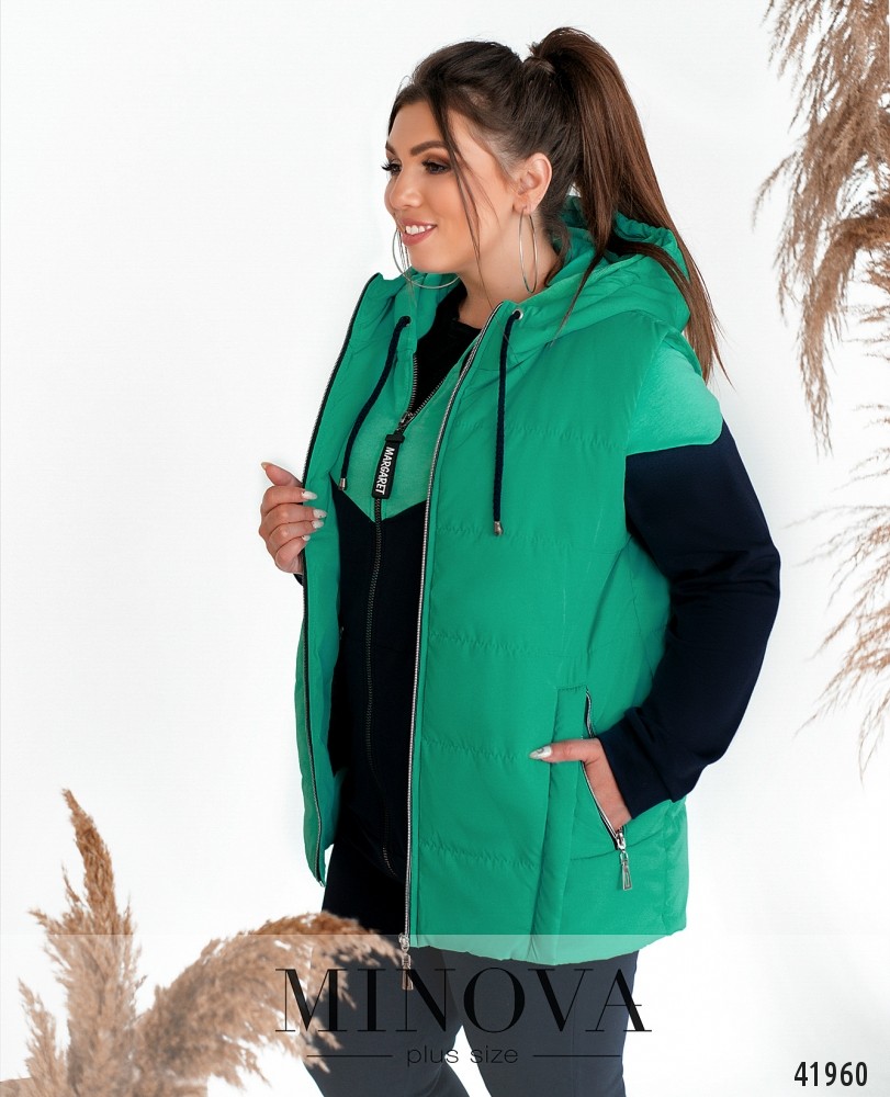 Стильный и удобный простёганый жилет батал с подкладкой и капюшоном. Через капюшон пропущен шнурок. По бокам - врезные карманы с молниями. Застёгивается на молнию по центру.