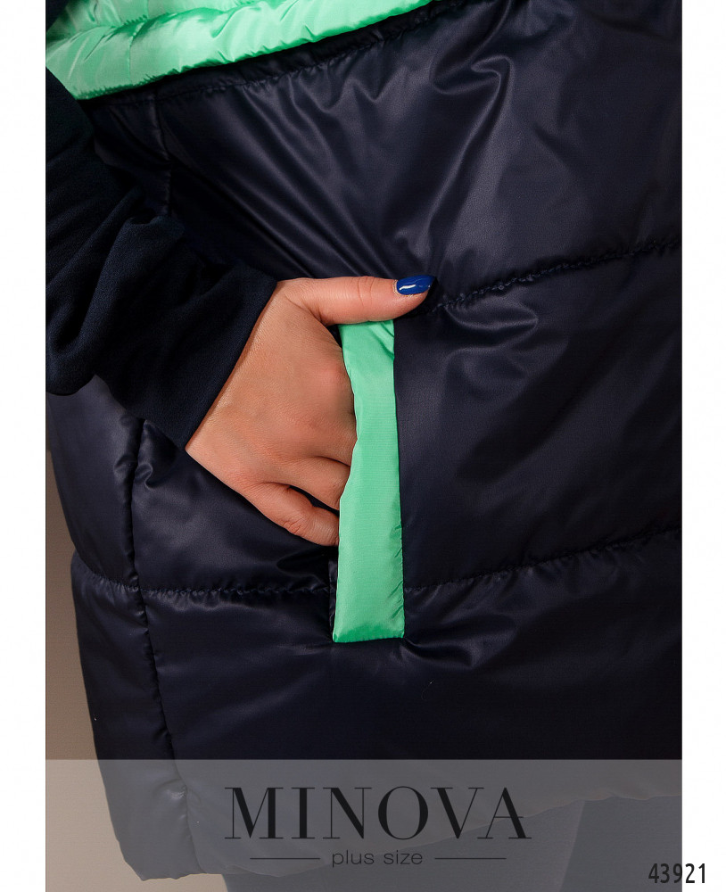 Стильный жилет плюс сайз из простёганной ткани с контрастными вставками на верхней части и на листочках прорезных карманов. Карманы без застёжек. Капюшон не отстёгивается, через него пропущен шнурок, в наличии подкладка. На левой стороне груди - декоративная нашивка. Застёгивается на молнию спереди по центру.
