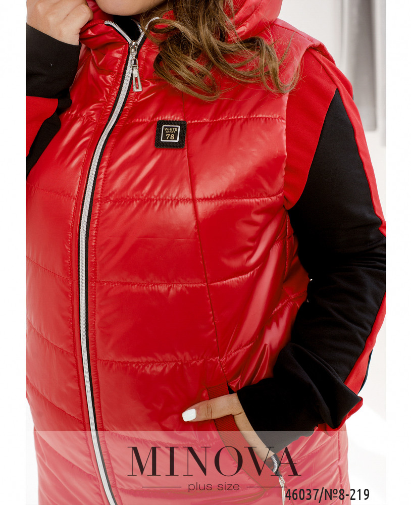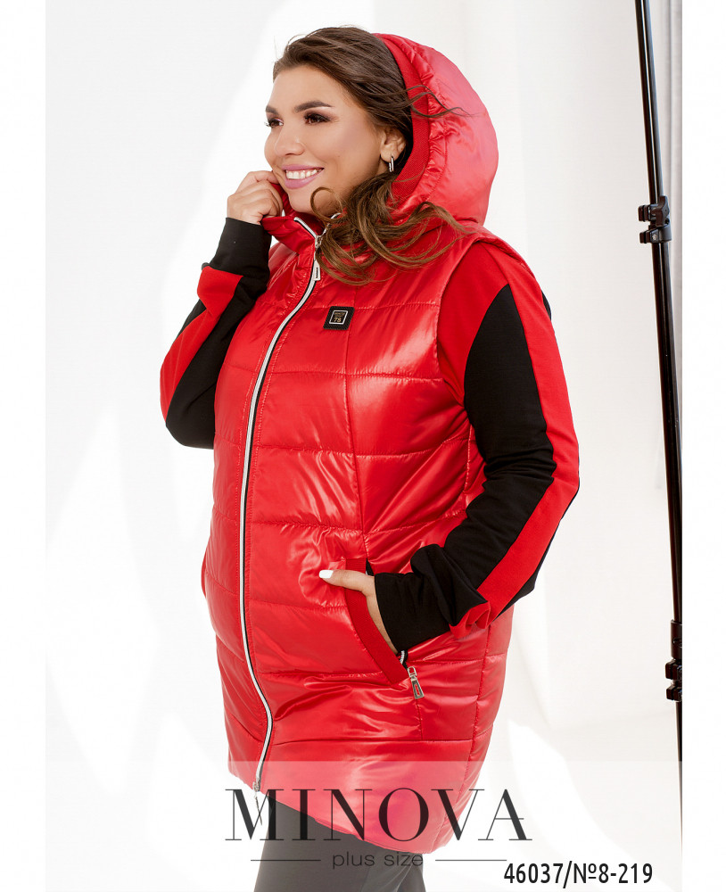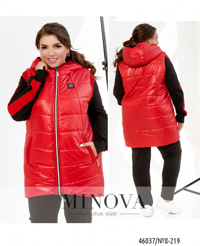 Привлекательный жилет батал с капюшоном, с подкладкой, простёганный. По бокам - врезные карманы с молнией. Застёгивается на молнию, расположенную по центру, от капюшона до низу.