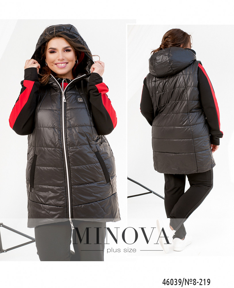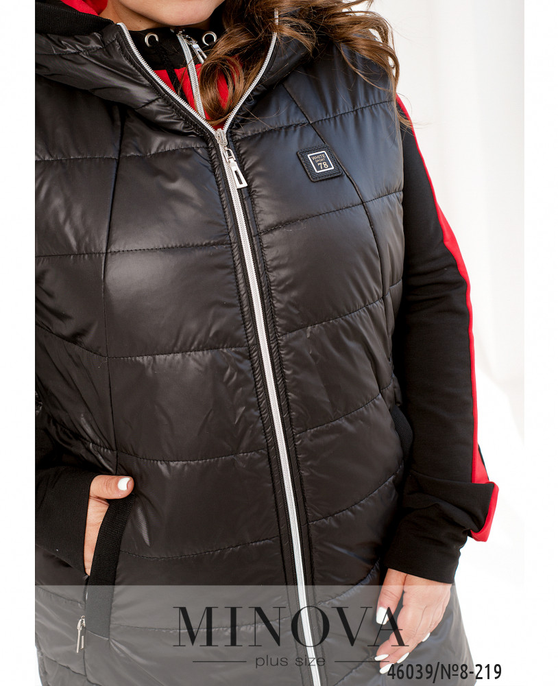 Привлекательный жилет батал с капюшоном, с подкладкой, простёганный. По бокам - врезные карманы с молнией. Застёгивается на молнию, расположенную по центру, от капюшона до низу.