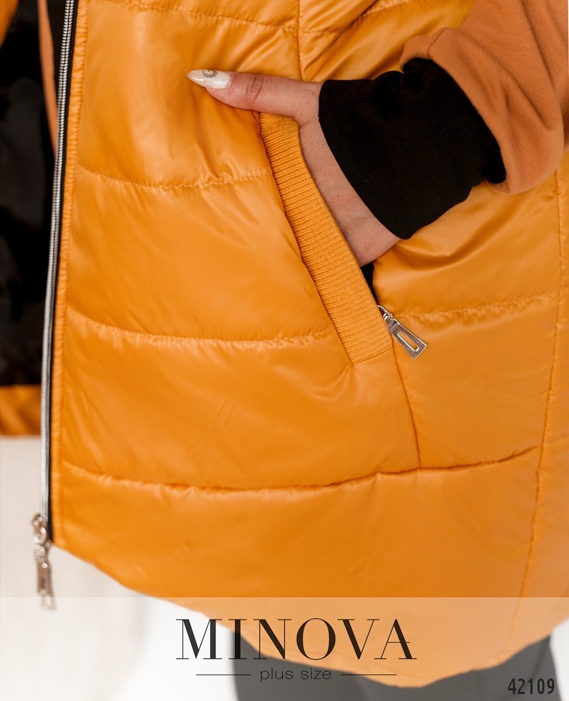 Привлекательный жилет батал с капюшоном, с подкладкой, простёганный. По бокам - врезные карманы с молнией. Застёгивается на молнию, расположенную по центру, от капюшона до низу.