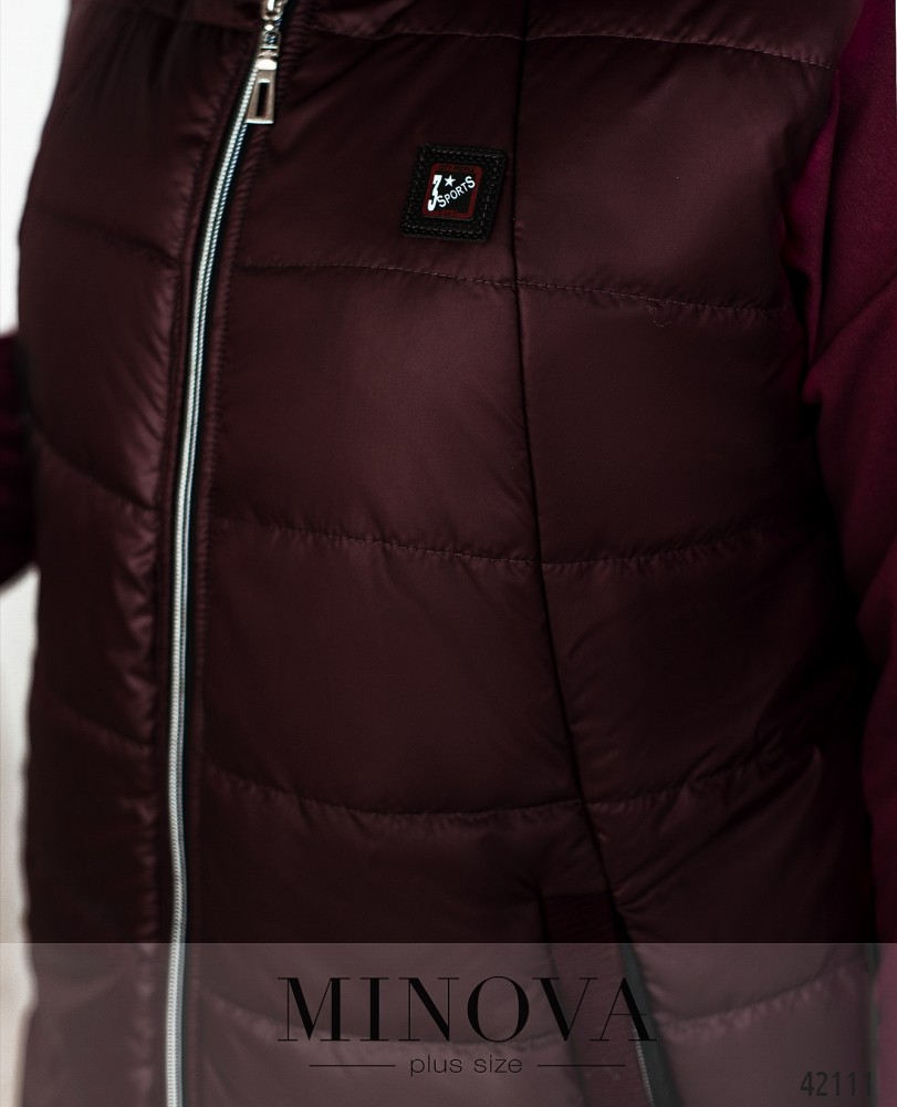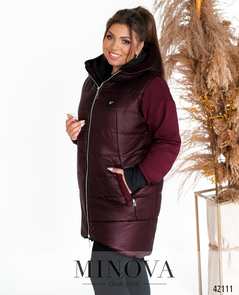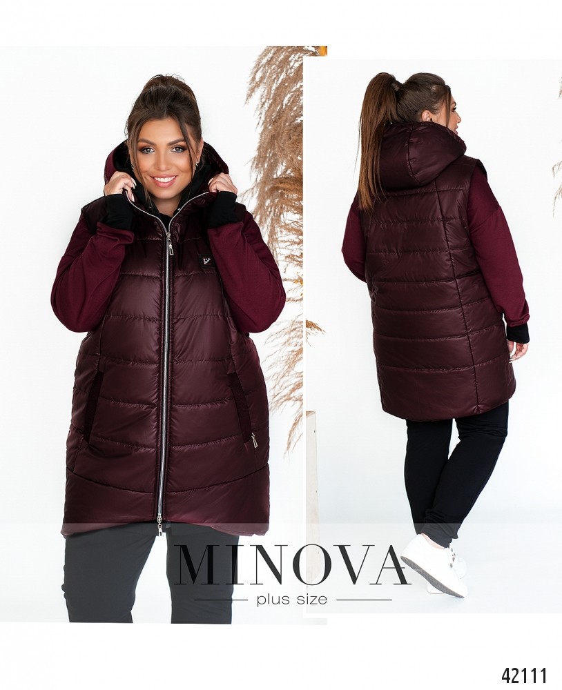 Привлекательный жилет батал с капюшоном, с подкладкой, простёганный. По бокам - врезные карманы с молнией. Застёгивается на молнию, расположенную по центру, от капюшона до низу.