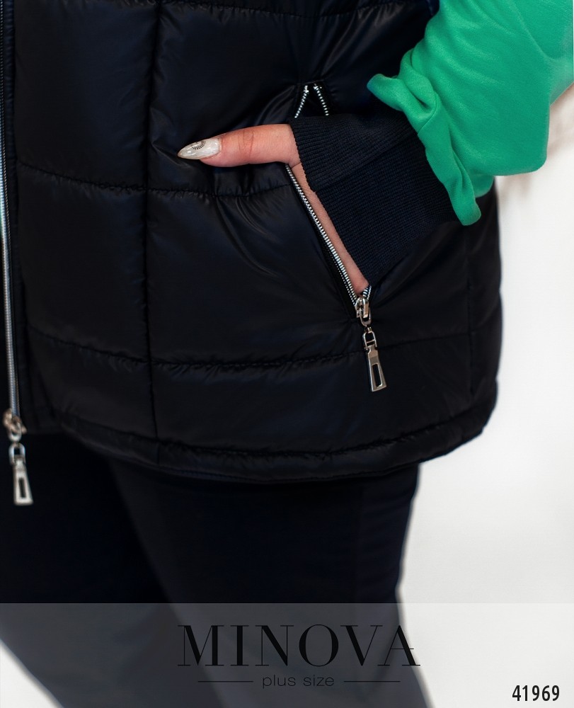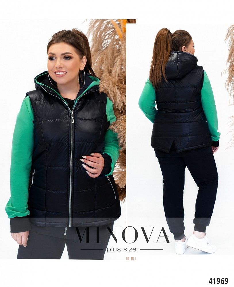 Удобный жилет большого размера с подкладкой, с капюшоном и врезными карманами по бокам, скрытыми под молнией. Жилет застёгивается на молнию по центру. Капюшон пристёгивается на молнию.