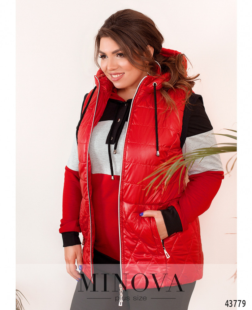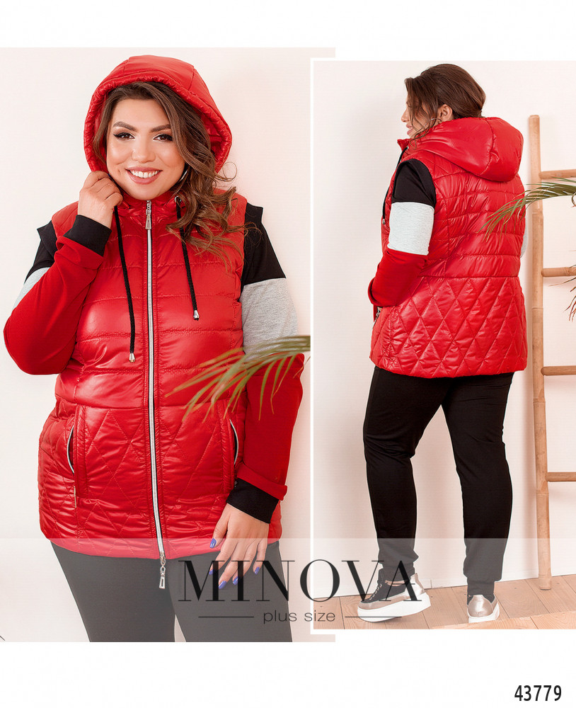 Комфортный жилет большого размера из простёганной ткани; сверху простёгана горизонтально, в нижней части - ромбами. По бокам - врезные карманы на молнии, спереди по центру также молния. В наличии капюшон, который не отстёгивается, через него пропущен шнурок. Жилет с подкладкой. Проймы с резинкой.