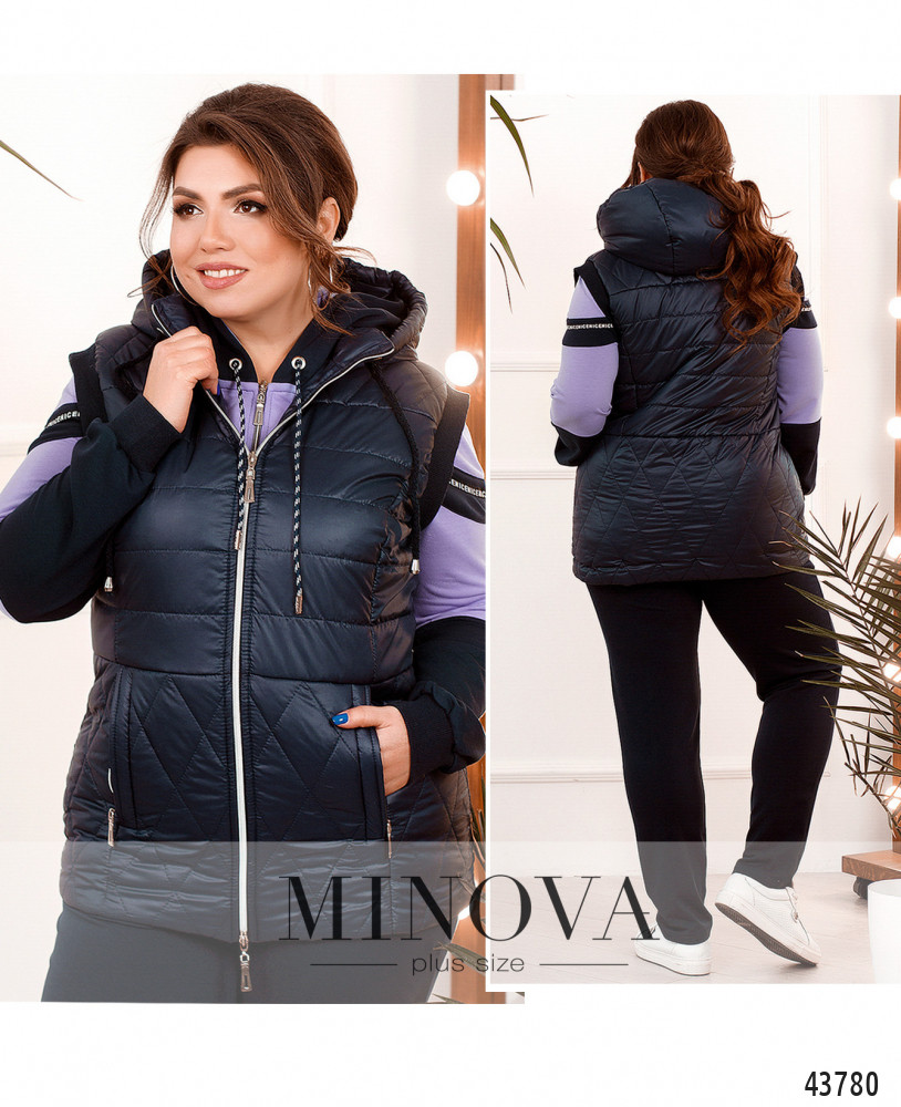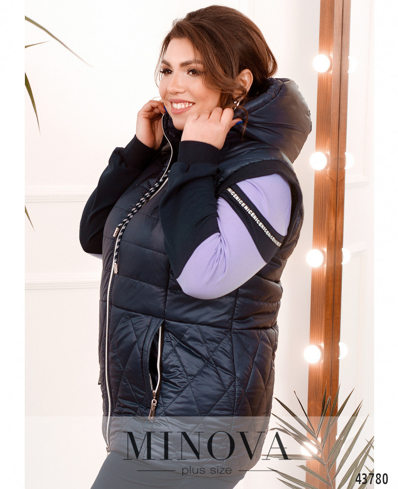 Комфортный жилет большого размера из простёганной ткани; сверху простёгана горизонтально, в нижней части - ромбами. По бокам - врезные карманы на молнии, спереди по центру также молния. В наличии капюшон, который не отстёгивается, через него пропущен шнурок. Жилет с подкладкой. Проймы с резинкой.