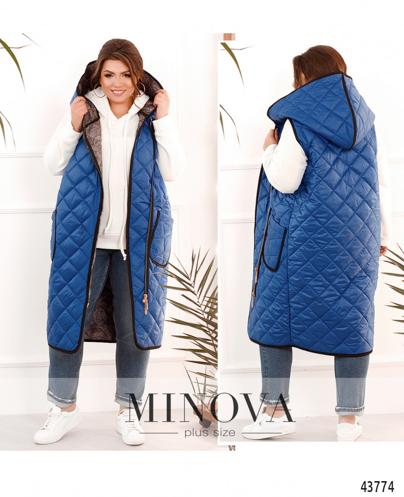 Стильный жилет большого размера с яркой подкладкой, ткань простёгана. Жилет с капюшоном, с накладными карманами и диагональной молнией; под ней - ткань, которая защищает от ветра. Капюшон не отстёгивается.