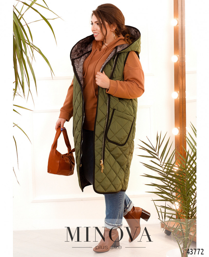 Стильный жилет большого размера с яркой подкладкой, ткань простёгана. Жилет с капюшоном, с накладными карманами и диагональной молнией; под ней - ткань, которая защищает от ветра. Капюшон не отстёгивается.