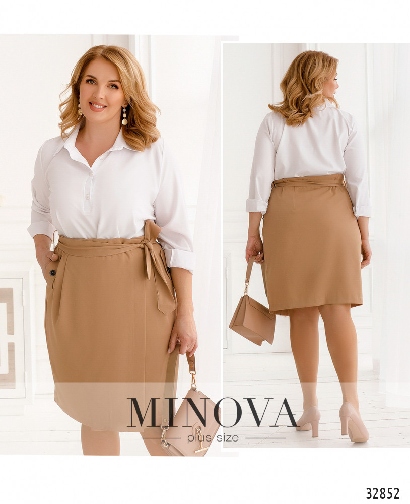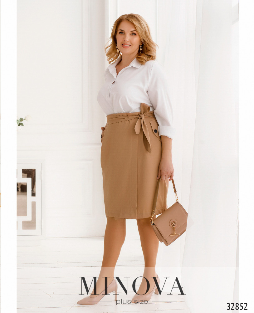 Строгая прямая юбка батал из новой коллекции Minova понравится всем, кому нужно периодически соблюдать дресс-код на работе или на учёбе. Можно выбрать супер-классическую чёрную, тёмно-синюю или более нейтральную бежевую. Юбка застёгивается на запАх с помощью одной пуговицы на поясе и дополнительно удерживается с помощью вшитого широкого пояса, который можно завязать фантазийным узлом и добавить индивидуальности в строгий образ. В наличии карманы с накладными клапанами, украшенными пуговкой. Прямой крой и фасон предполагает элегантные туфли на высоком каблуке.