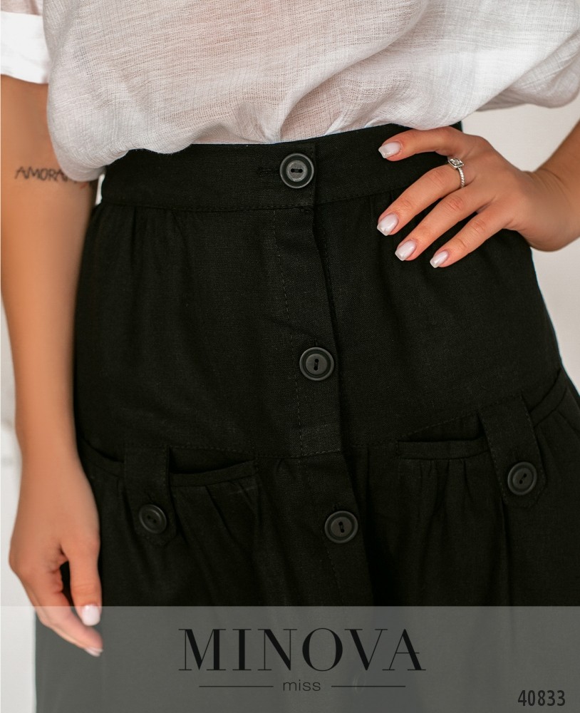 Лёгкая минималистичная юбка-солнце, застёгивается на ряд пуговиц на планке, спереди - два врезных кармана с клапанами. В пояс сзади вшита резинка. По бокам подола - скруглённые разрезы.