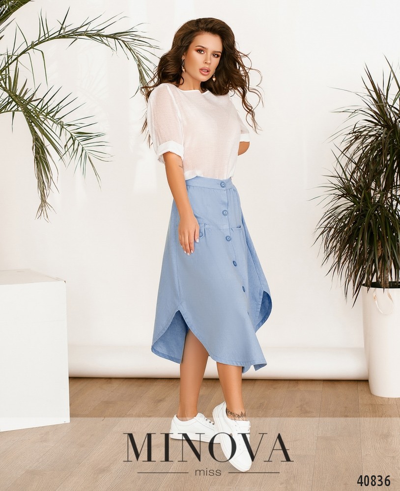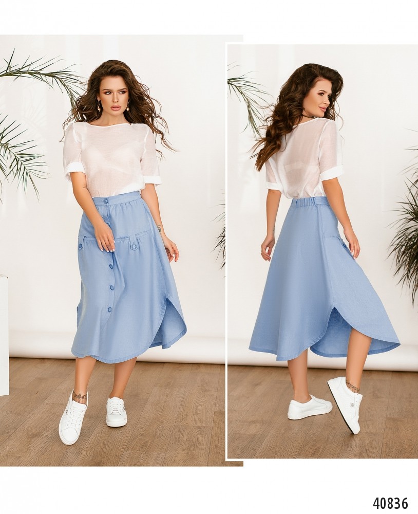 Лёгкая минималистичная юбка-солнце, застёгивается на ряд пуговиц на планке, спереди - два врезных кармана с клапанами. В пояс сзади вшита резинка. По бокам подола - скруглённые разрезы.