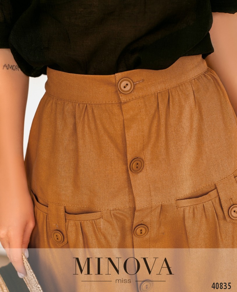 Лёгкая минималистичная юбка-солнце, застёгивается на ряд пуговиц на планке, спереди - два врезных кармана с клапанами. В пояс сзади вшита резинка. По бокам подола - скруглённые разрезы.