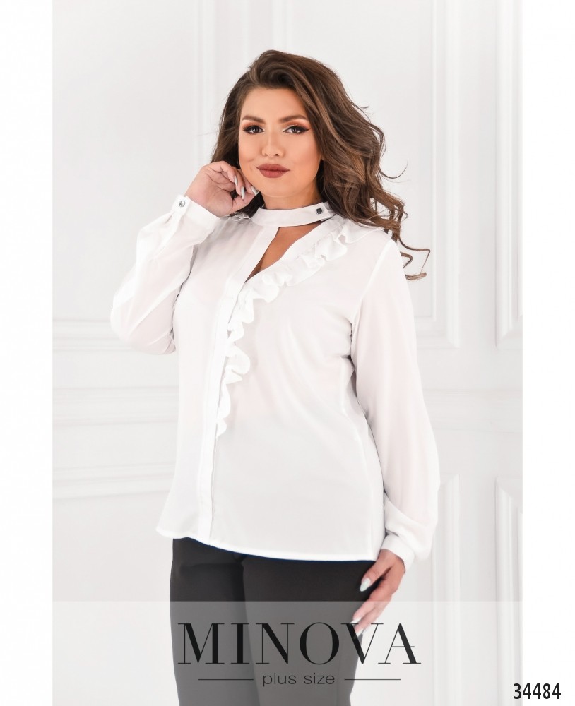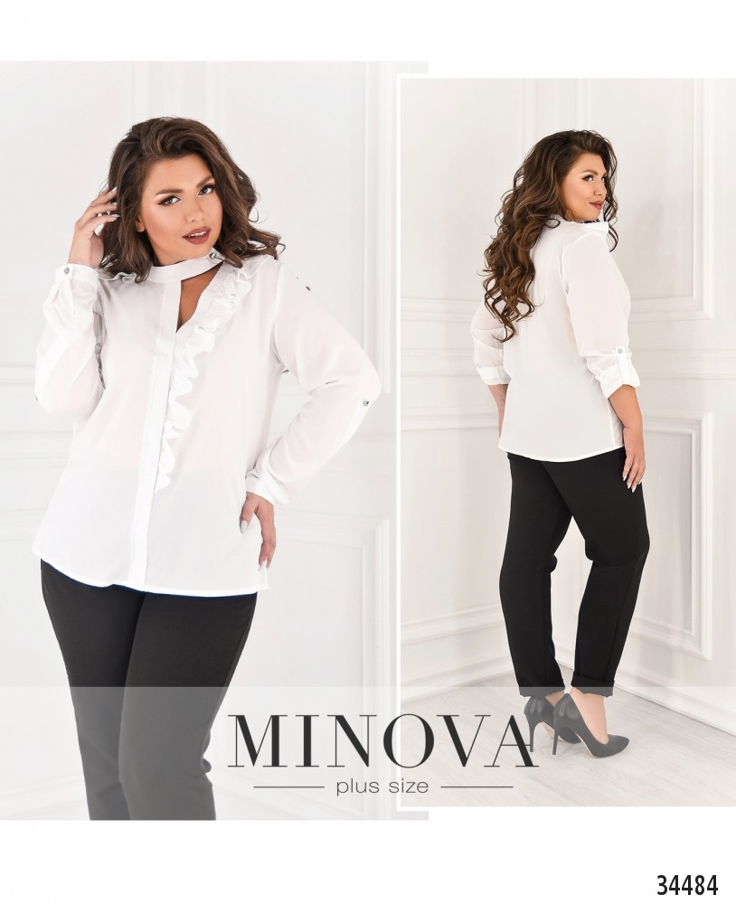 Любишь нестандартную одежду и такие фасоны, которых точно не встретишь в гардеробе своих подруг? Minova представляет модель рубашки батал, которая выглядит по-настоящему оригинально! На первый взгляд – классическая рубашка, но множество мелких деталей делают её неповторимой. Воротник-стоечка, застёгивается на одну пуговицу. Других застёжек на рубашке нет, но они и не нужны: от линии, где должны располагаться пуговицы, и до плеча – довольно глубокий треугольный вырез, отороченный оборками. На плечах тоже небольшие оборки в виде «погончиков». Рукава регулируются на ленту и пуговку, в наличии манжеты с одной пуговицей. Такая рубашка впишется в нестрогий дресс-код для неофициальных мероприятий, её можно носить с брюками, джинсами или юбкой прямого кроя.