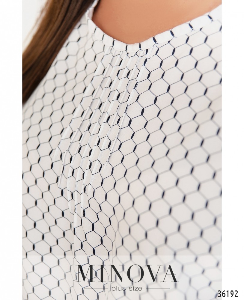 Нежная и оригинальная блузка батал из нового пополнения каталога Minova. Блуза свободного кроя, к подолу подшит ряд плиссированных складок. Вырез горловины полукруглый, неглубокий, под ним ткань присобрана продольными вытачками. Карманов и застёжек нет. Рукава длиной ¾, без манжет, но с регулировкой на ленту и пуговицу. Блуза из лёгкой ткани, с приятным универсальным принтом, который позволит вписать её в твой базовый повседневный гардероб. Носить рекомендуется навыпуск с джинсами или брюками, а также можно сочетать с юбкой-карандашом. Аксессуары лучше выбирать однотонные.