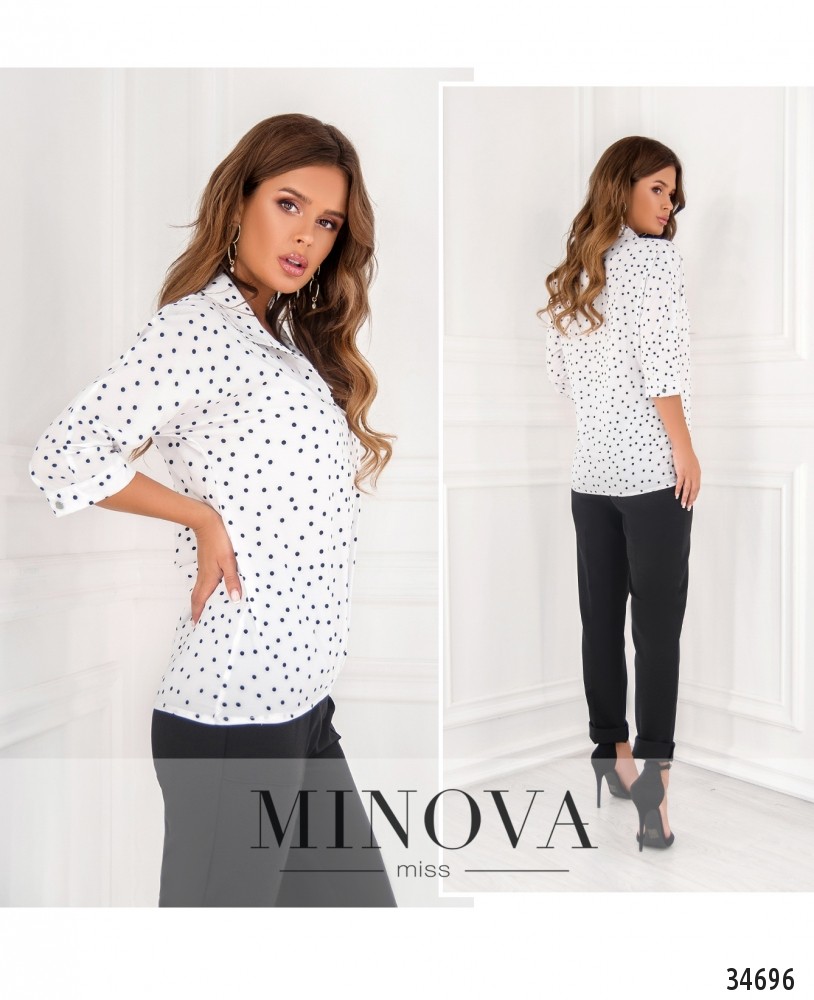 Привлекательная рубашка в мелкий горошек разнообразит ваш повседневный гардероб и придаст ему нотку лёгкости и беззаботности. Рубашка без застёжек и карманов, воротничок широкий, отложной, рукава длиной ¾, с манжетами, на манжетах – небольшие квадратные пуговки на ножке. Подол асимметричный, спереди присобран, по спинке чуть длиннее, а потому такой фасон рекомендуется девушкам с «яблочной» или «грушевой» фигурой. Рубашку свободного кроя лучше носить навыпуск, сочетая с брюками или джинсами. В каталоге представлены модели светлых и тёмных оттенков, так что они прекрасно впишутся в ваш базовый набор одежды на каждый день. Украшение не входит в комплект. Пояс/аксессуар не входит в комплект.