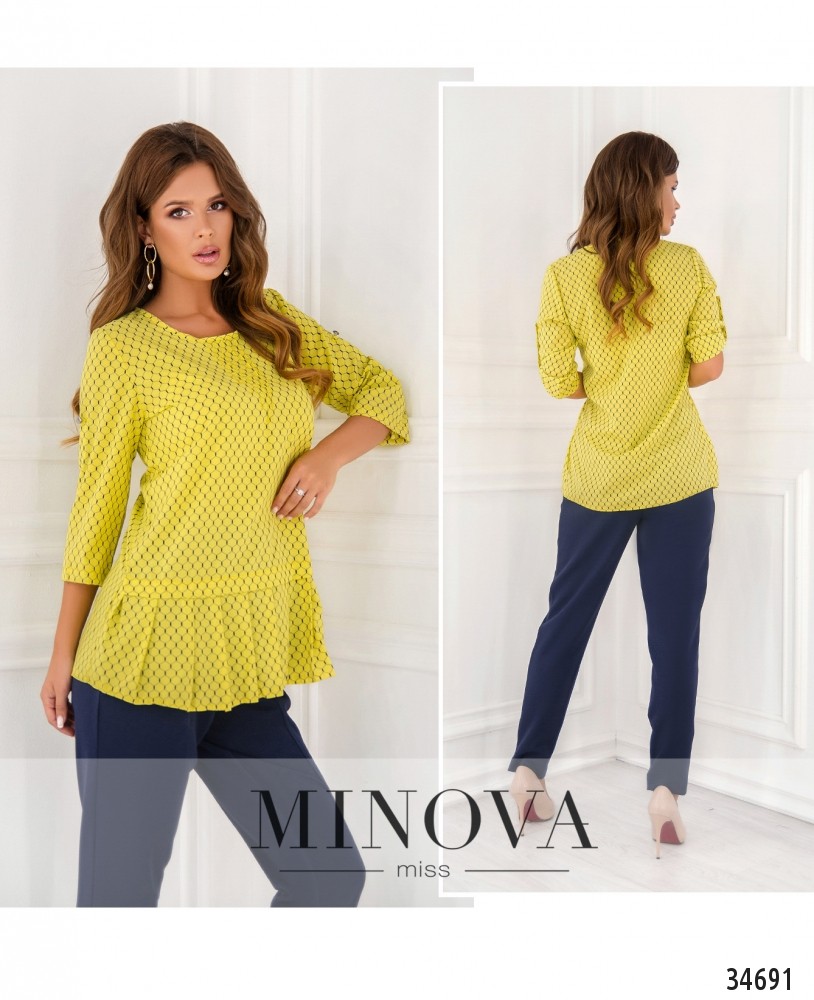 Симпатичная и женственная блуза без застёжек – прекрасный выбор для делового или повседневного наряда. Яркие и тёмные оттенки представлены в новой коллекции Minova. Блуза без карманов, свободного кроя, к подолу подшит ряд плиссированных оборок, вырез горловины – полукруглый, от него вниз спускается ряд продольных вытачек, который позволяет блузе очень хорошо сидеть на груди. Рукава длиной ¾, их можно укоротить с помощью ленты и подшитой пуговки до уровня чуть выше локтя. Принт неброский, в виде шестиугольников по типу «пчелиных сот». Блуза будет удачно смотреться на фигуре типа «перевёрнутый треугольник», её можно сочетать с любым низом: брюками, джинсами или длинной прямой юбкой. Украшение не входит в комплект. Пояс/аксессуар не входит в комплект.