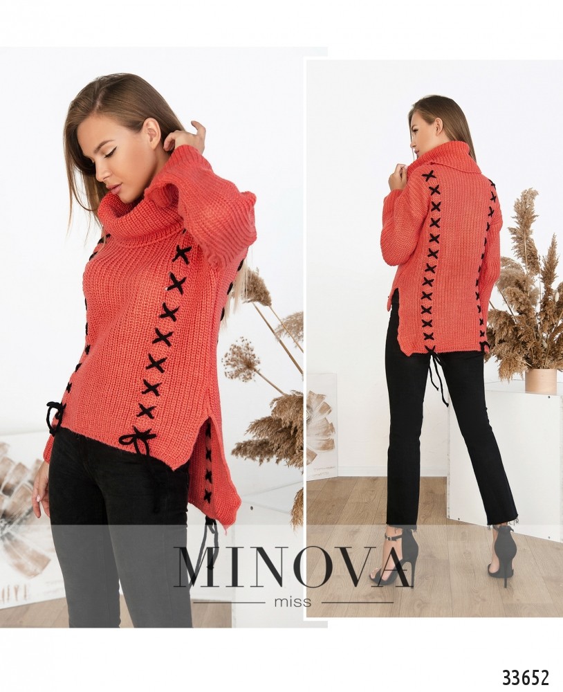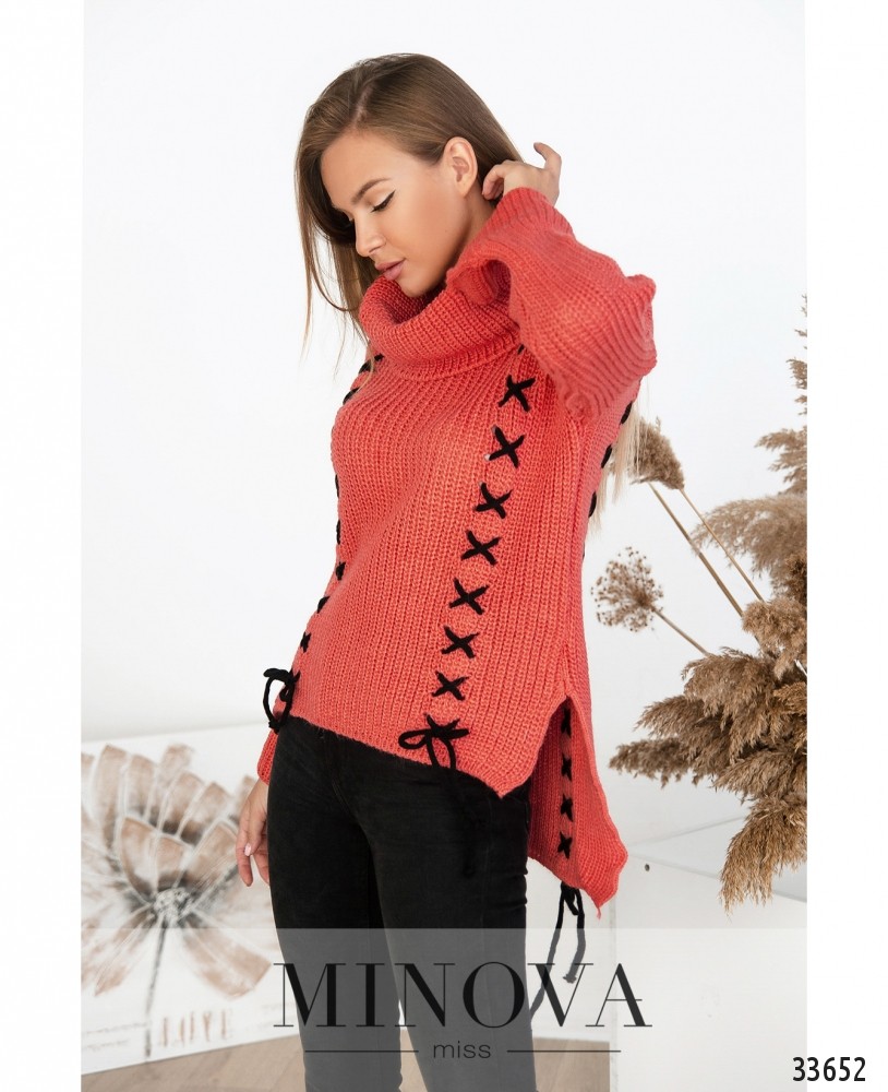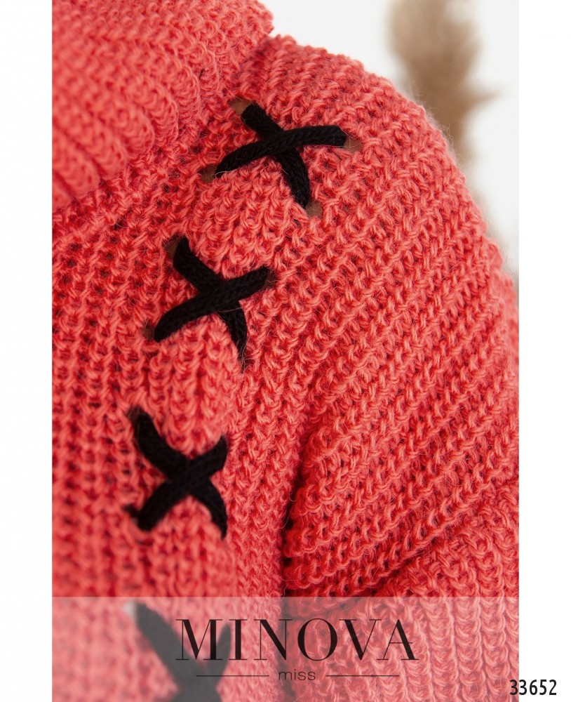 Не бойтесь экспериментировать с образами! Вязаный свитер в глубоких оттенках добавит настроения в привычный нейтральный гардероб. А эффектные детали в виде контрастной шнуровки и расклешенные рукава-колокола подчеркнут креативность Вашей натуры. Рукава подворачиваются в широкие манжеты. Широкий воротник-гольф и удлиненный на спине подол с разрезами дополнительно защищают от неуютного осеннего ветра.