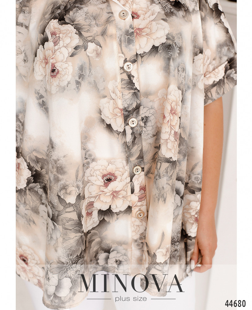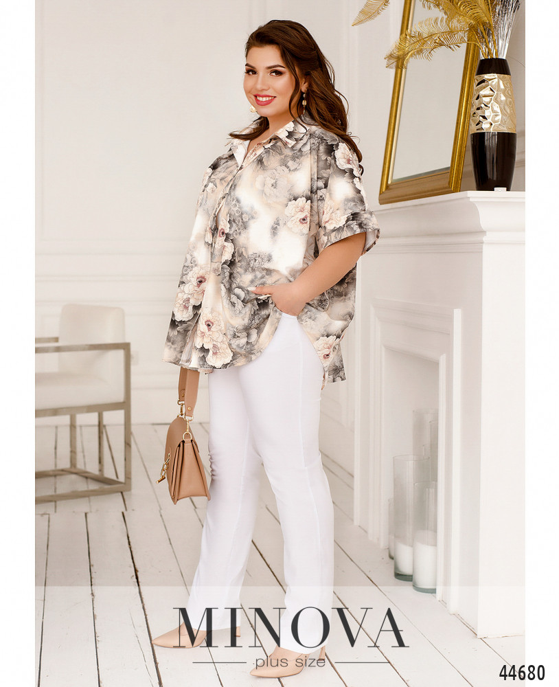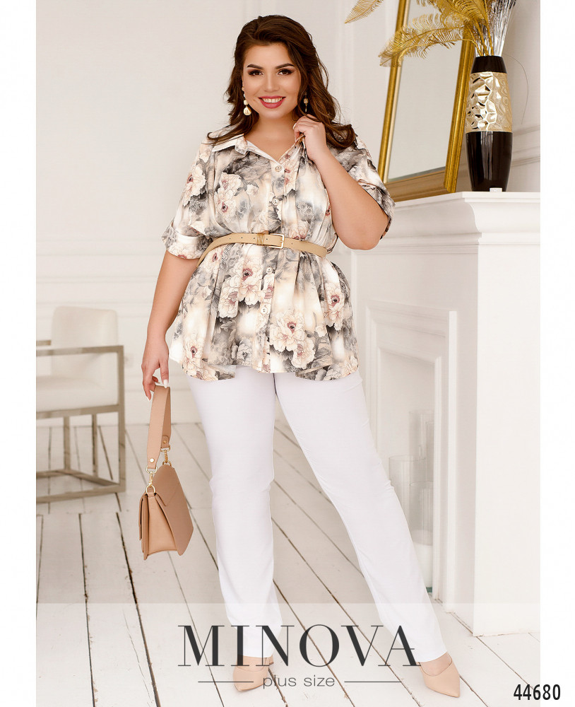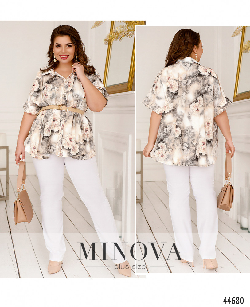 Стильный костюм батал, рубашка с отложным воротничком, рукава короткие, с манжетами. Застёжка - ряд пуговиц спереди на планке. Карманов нет. Брюки со вшитой в пояс резинкой, по бокам - карманы в шве, посадка высокая, застёжек нет.