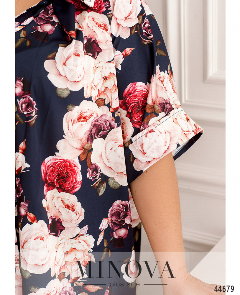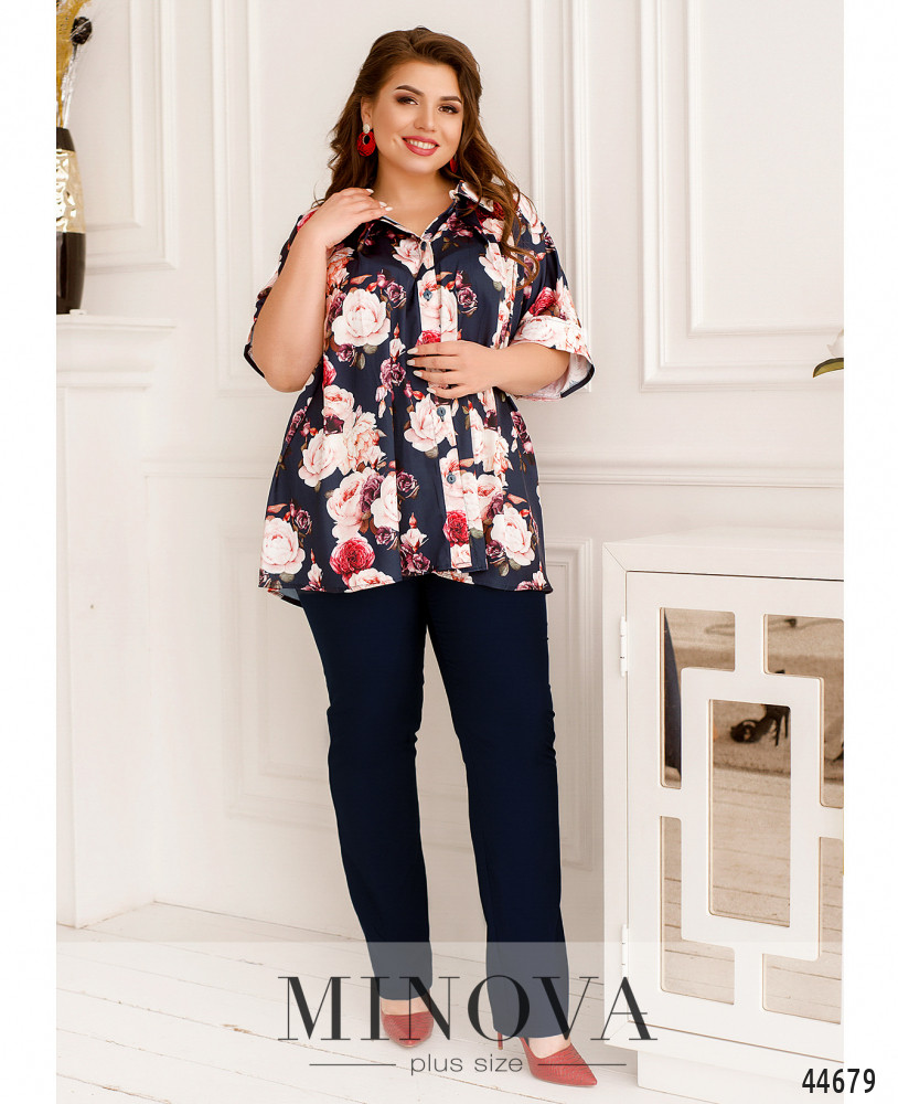 Стильный костюм батал, рубашка с отложным воротничком, рукава короткие, с манжетами. Застёжка - ряд пуговиц спереди на планке. Карманов нет. Брюки со вшитой в пояс резинкой, по бокам - карманы в шве, посадка высокая, застёжек нет.
