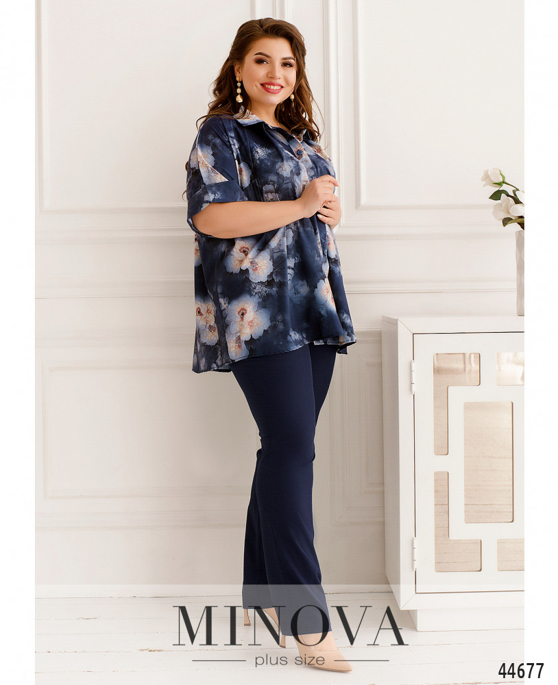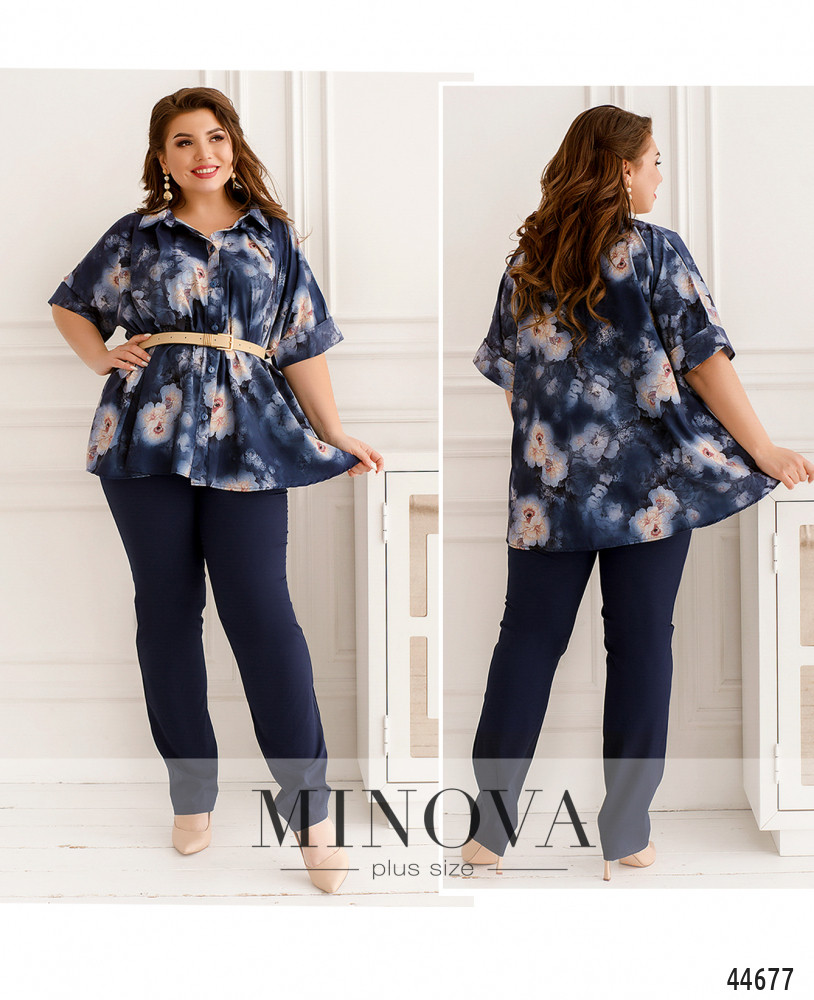 Стильный костюм батал, рубашка с отложным воротничком, рукава короткие, с манжетами. Застёжка - ряд пуговиц спереди на планке. Карманов нет. Брюки со вшитой в пояс резинкой, по бокам - карманы в шве, посадка высокая, застёжек нет.