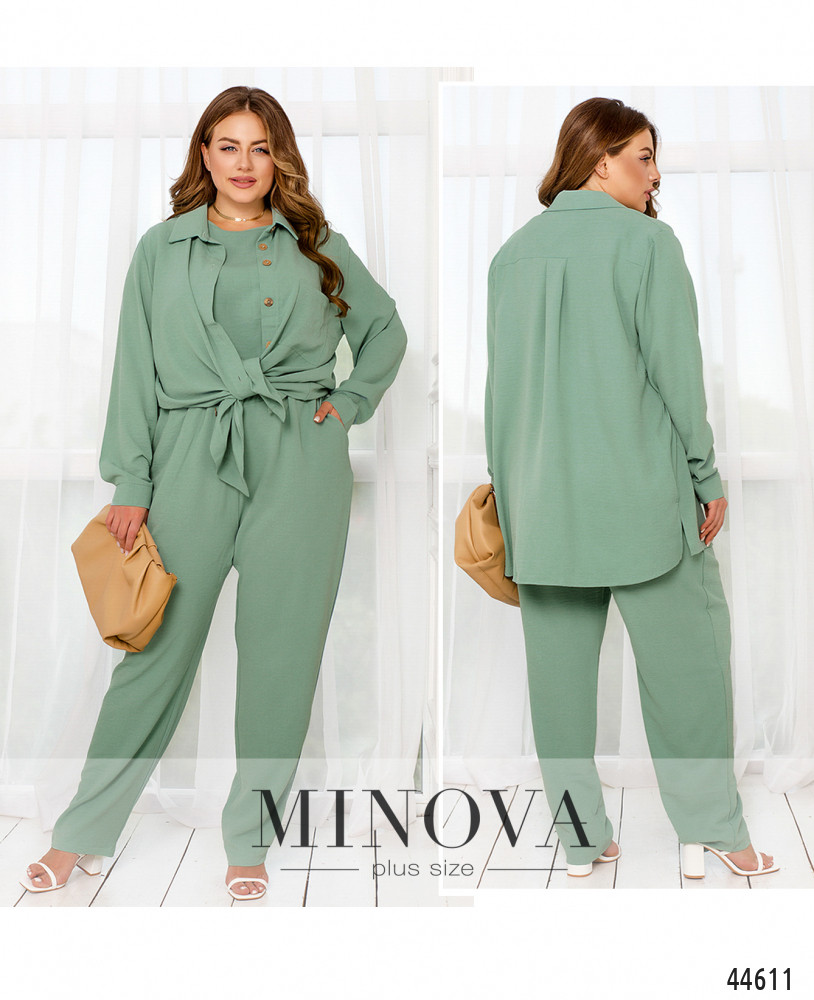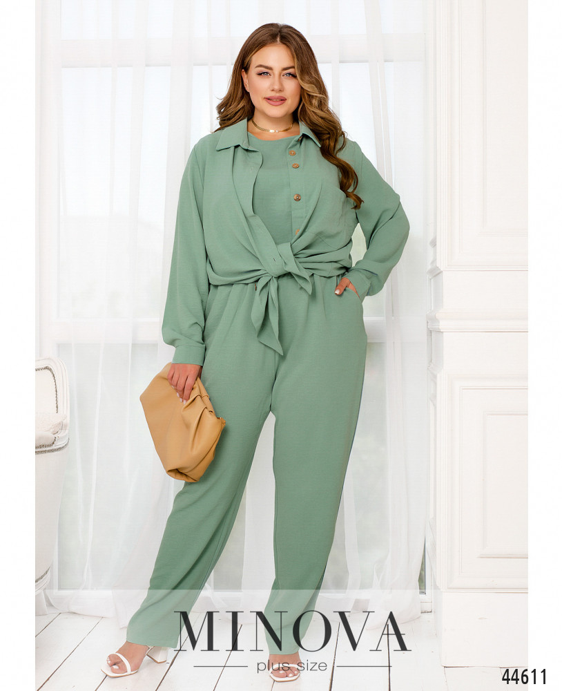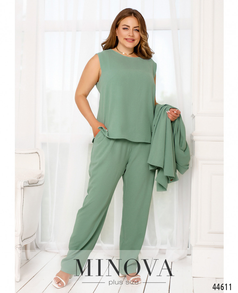 Элегантный и стильный костюм тройка большого размера. Верхняя рубашка удлинённая, с отложным воротничком, на груди накладной карман, по бокам - длинные разрезы. На рукавах манжеты, на манжетах по одной пуговке. Брюки с высокой талией, по бокам - карманы в шве, в пояс вшита резинка. Майка с полукруглым вырезом горловины, на груди вытачки, по бокам подола - разрезы. Без карманов и застежек.