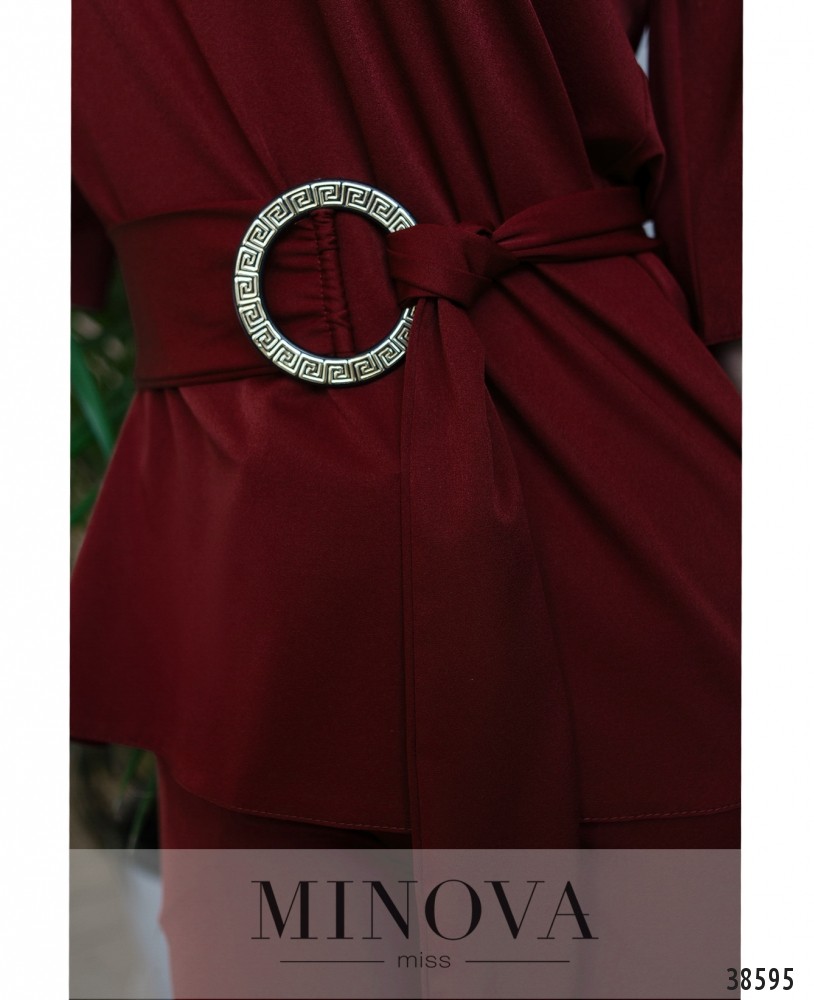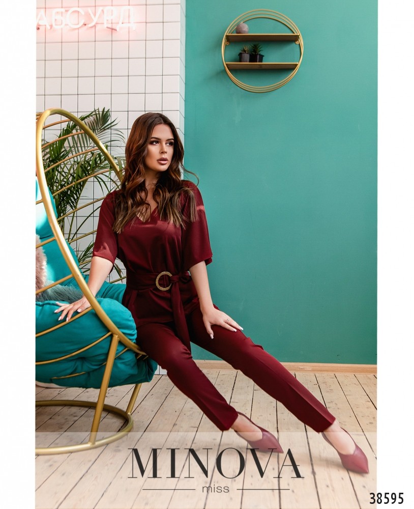 Строгий лёгкий костюм с брюками и блузой. Блуза с V-образным вырезом горловины, рукава немного расклешены, без манжет, застёжек и карманов нет. Брюки с высокой талией, с наглаженными «стрелками», застёгиваются на пуговицу и молнию под ширинкой, в пояс сзади вшита резинка, по бокам - карманы. В комплекте – пояс в тон с круглой пряжкой.