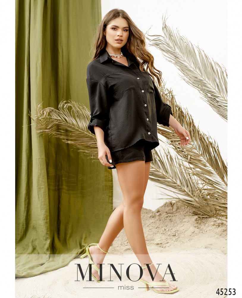 Однотонный женственный костюм поможет создать идеальный образ в стиле casual. Универсальная блуза-рубашка с длинными рукавами и накладными карманами дополнена короткими шортами в тон на резинке с карманами в боковых швах. Костюм выполнен из тонкого легкого материала, поэтому в нем вы будете чувствовать свежесть даже в самый жаркий летний день.