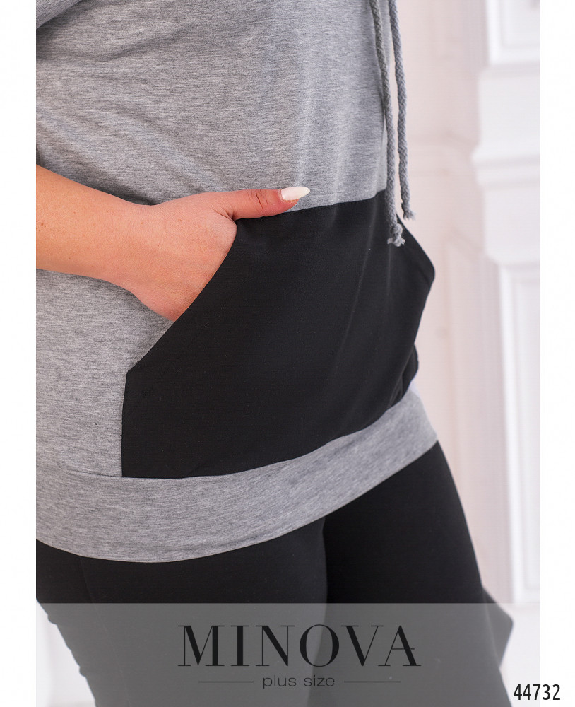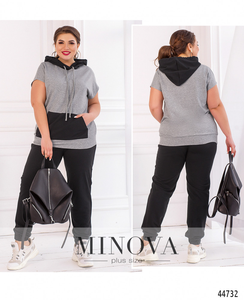 Стильный костюм-двойка батал, толстовка с коротким рукавом "летучая мышь", в наличии капюшон с пропущенным через него шнурком. На талии - карман-кенгуру. Подол с манжетом. Застёжек нет. Брюки с высокой талией, в пояс и в манжеты вшиты резинки, по бокам - карманы в шве. Застёжек нет.
