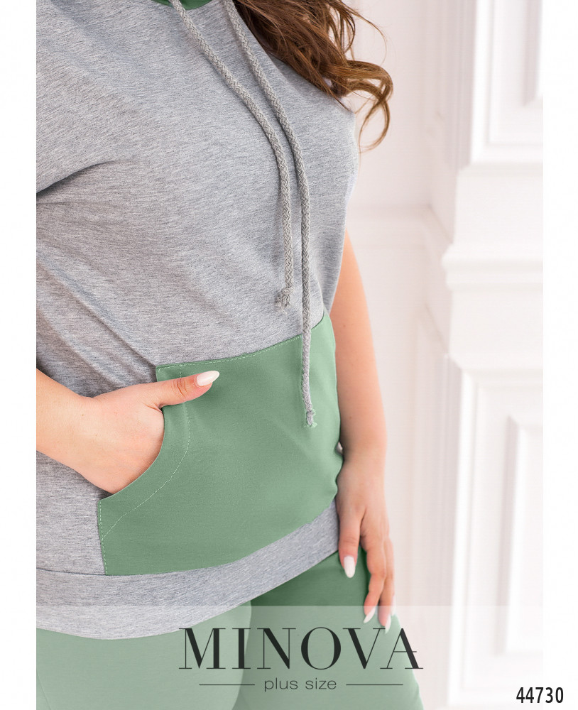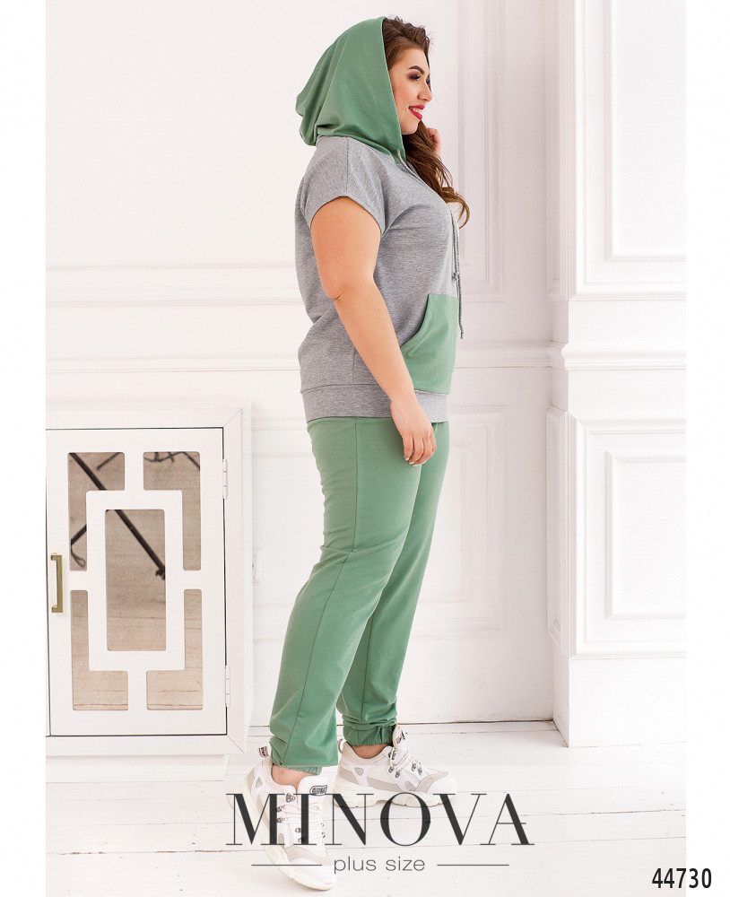 Стильный костюм-двойка батал, толстовка с коротким рукавом "летучая мышь", в наличии капюшон с пропущенным через него шнурком. На талии - карман-кенгуру. Подол с манжетом. Застёжек нет. Брюки с высокой талией, в пояс и в манжеты вшиты резинки, по бокам - карманы в шве. Застёжек нет.