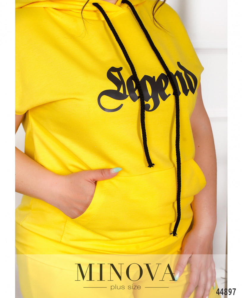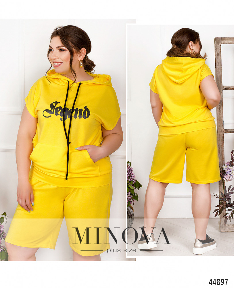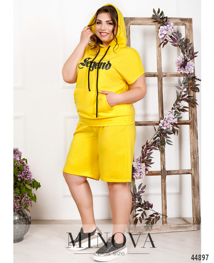 Мягкий и стильный спортивный костюм большого размера. Худи с карманом-кенгуру на талии, на груди - принт, в наличии капюшон, через него пропущены шнурки, отверстия без люверсов. Рукава очень короткие. Шорты с высокой талией, по бокам - карманы в шве, на левом кармане - принт, идентичный тому, что на блузе. Без застёжек, в пояс вшита резинка.