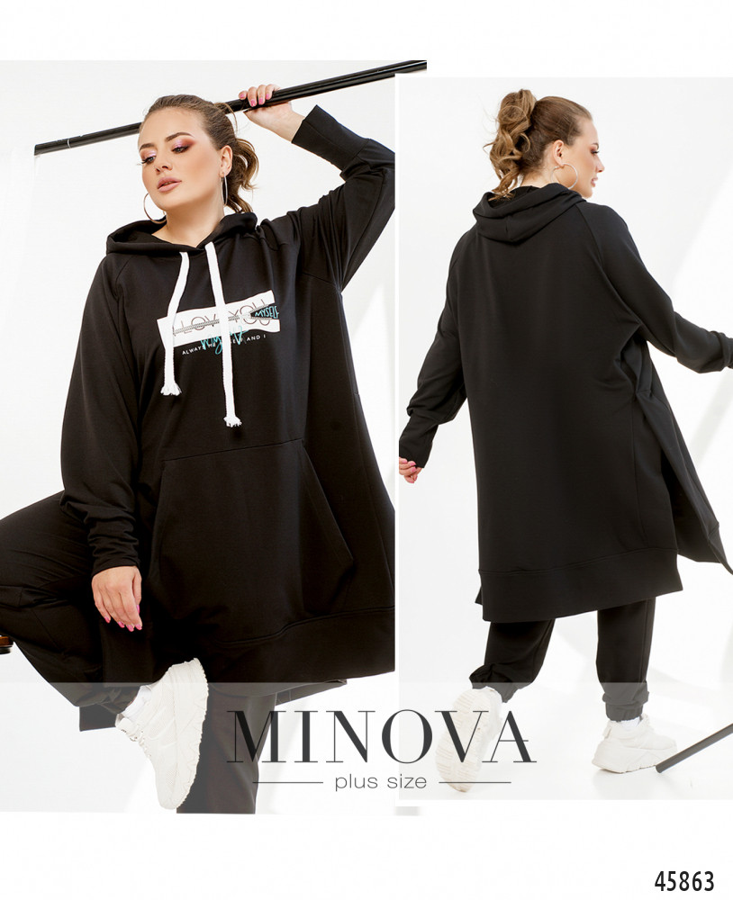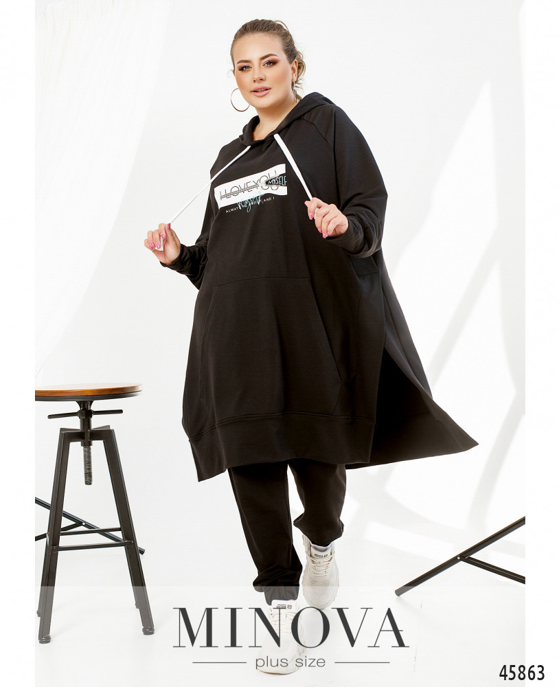 Оригинальный костюм с длинной толстовкой и брюками. Толстовка с капюшоном, через него пропущен шнурок. Рукава с мягкими манжетами, спереди  - карман-кенгуру. По бокам - очень длинные разрезы. На груди декоративный принт. Брюки с манжетами, в пояс вшита резинка, по бокам - карманы в шве, посадка высокая.