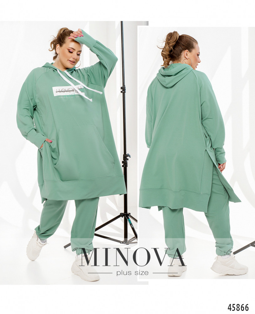 Оригинальный костюм с длинной толстовкой и брюками. Толстовка с капюшоном, через него пропущен шнурок. Рукава с мягкими манжетами, спереди  - карман-кенгуру. По бокам - очень длинные разрезы. На груди декоративный принт. Брюки с манжетами, в пояс вшита резинка, по бокам - карманы в шве, посадка высокая.