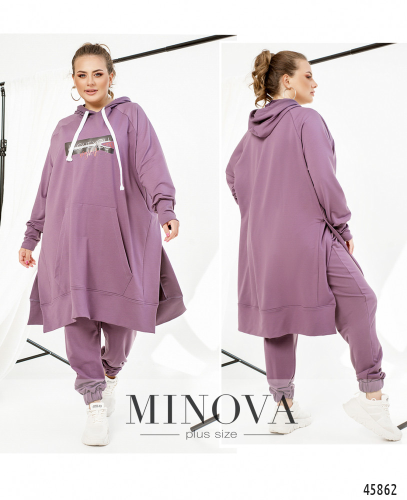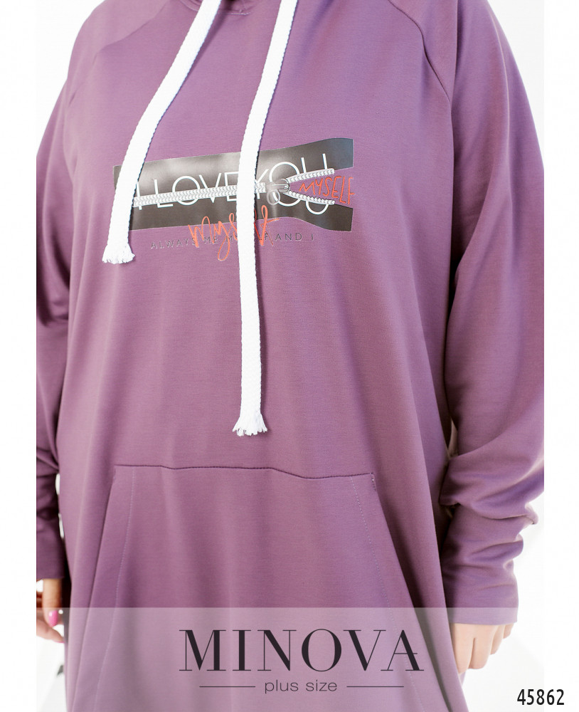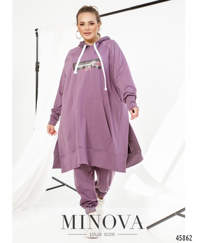 Оригинальный костюм с длинной толстовкой и брюками. Толстовка с капюшоном, через него пропущен шнурок. Рукава с мягкими манжетами, спереди - карман-кенгуру. По бокам - очень длинные разрезы. На груди декоративный принт. Брюки с манжетами, в пояс вшита резинка, по бокам - карманы в шве, посадка высокая.