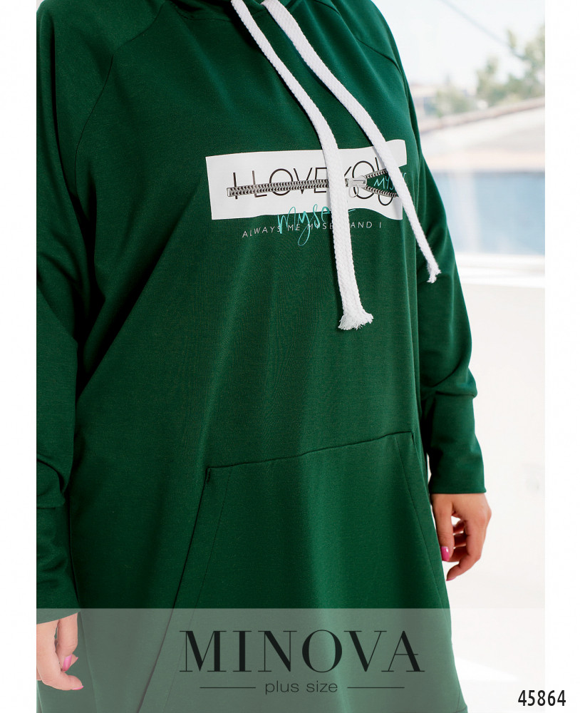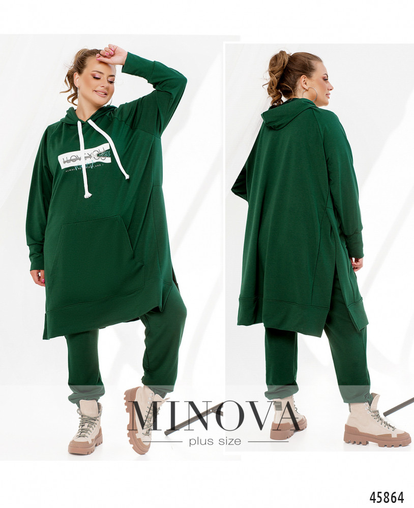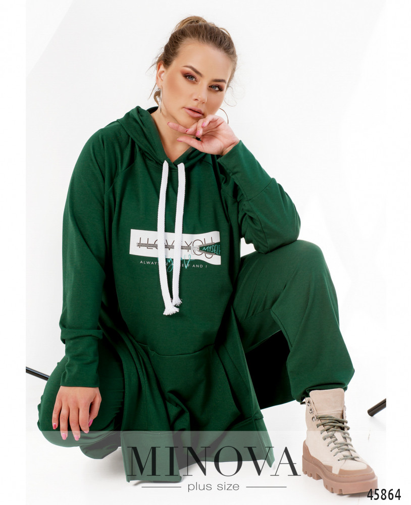 Оригинальный костюм с длинной толстовкой и брюками. Толстовка с капюшоном, через него пропущен шнурок. Рукава с мягкими манжетами, спереди - карман-кенгуру. По бокам - очень длинные разрезы. На груди декоративный принт. Брюки с манжетами, в пояс вшита резинка, по бокам - карманы в шве, посадка высокая.