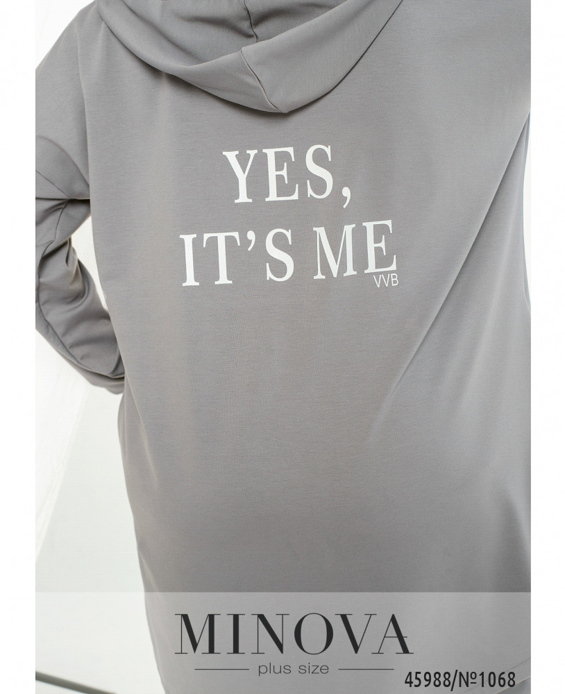 Оригинальный спортивный костюм порадует поклонниц практичной одежды на каждый день. Брюки с высокой посадкой дополнены манжетами и врезными карманами по бокам, а снизу - манжетами, в которые вшита резинка. Удлиненная туника, застегивающаяся на змейку, с капюшоном, карманами, и ассиметричным низом, удлиненным по спинке, декорирована принтом.