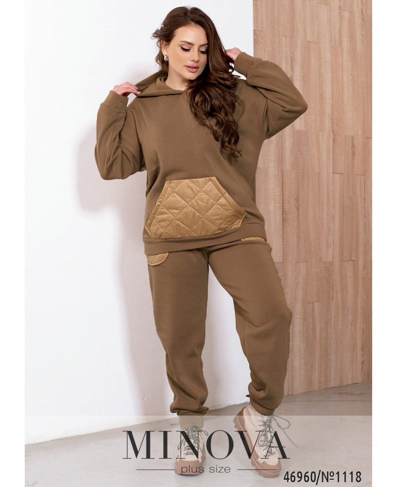 Оригинальный спортивный костюм может стать любимой вещью для женщины, ценящей практичность и не забывающей о модных тенденциях. В комплект входят однотонные брюки-джоггеры на резинке с накладными карманами, выполненными из стеганой плащевой ткани, а также модное худи с капюшоном и таким же стеганым карманом-кенгуру, как и на брюках.