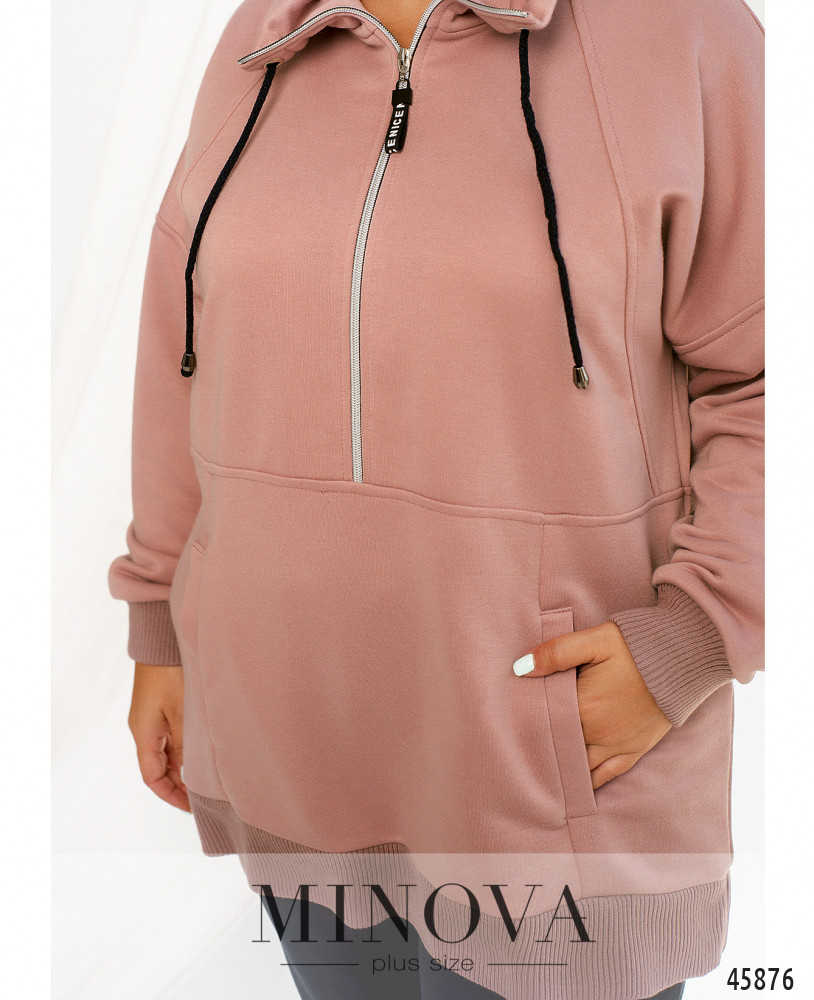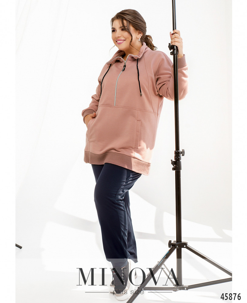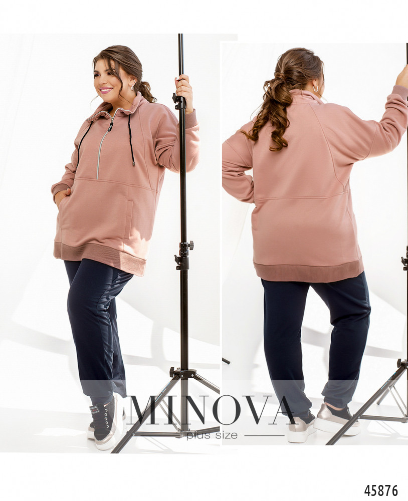 Стильный спортивный костюм батал с длинной толстовкой, толстовка с капюшоном, через отверстия, укреплённые люверсами, пропущен шнурок. По центру - вшитый под планкой и под молнией карман. Рукава с мягкими манжетами. Брюки с высокой талией, в пояс вшита резинка, по бокам - карманы. На подоле - длинные разрезы сбоку.