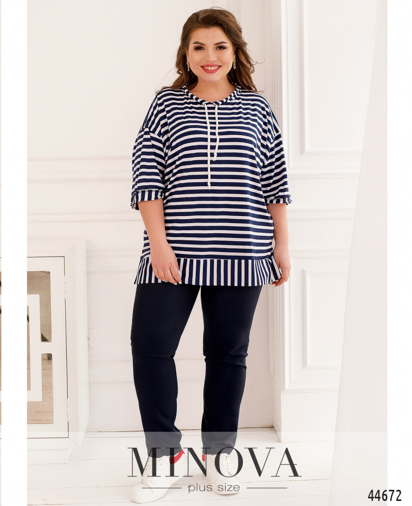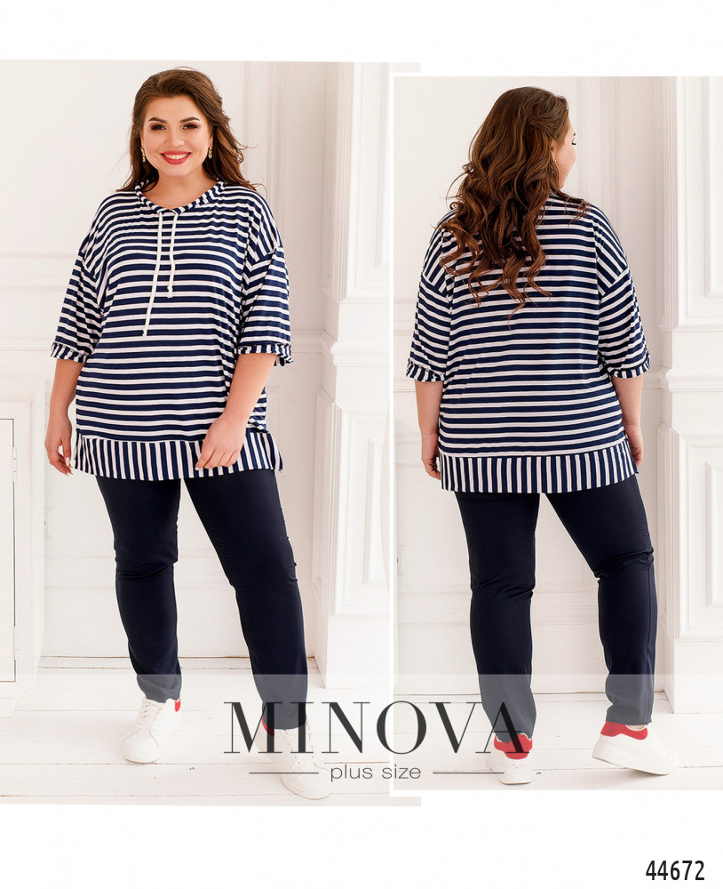Элегантный и яркий костюм батал, блуза длинная, мягкая, через полукруглый вырез горловины под кулиской пропущен шнурок. Рукава с небольшими манжетами. По бокам подола - разрезы. Застёжек и карманов нет, подол также с манжетом. Брюки с высокой талией, в пояс вшита резинка, застёжек нет, по бокам - карманы в шве.