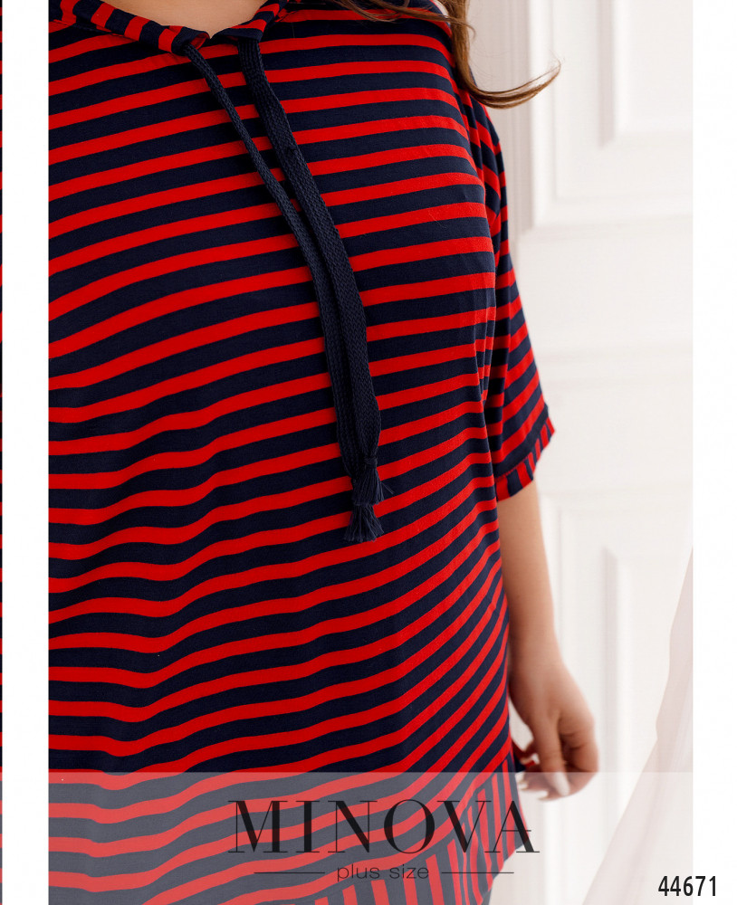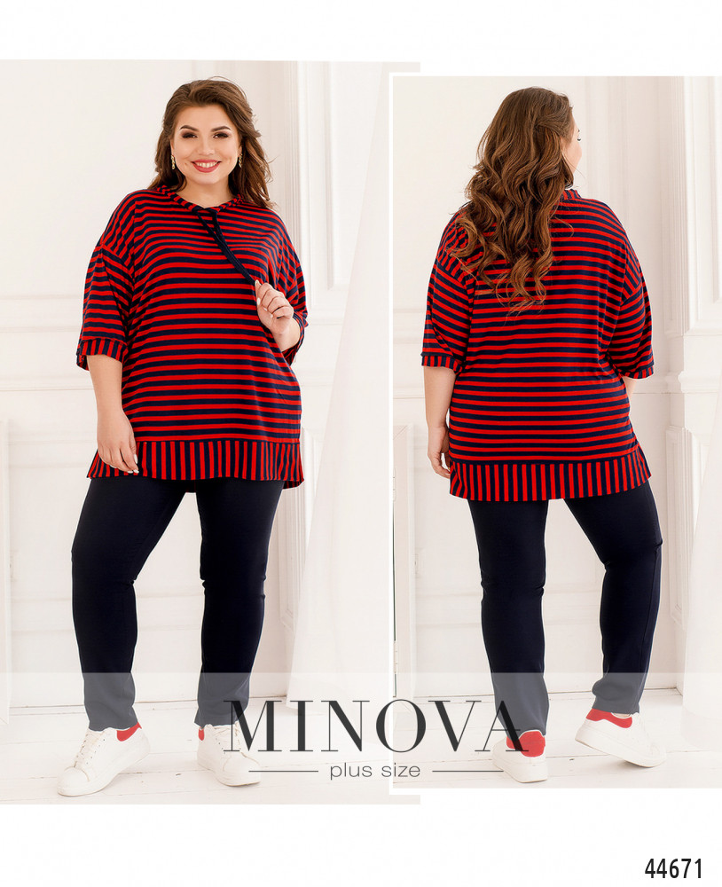 Элегантный и яркий костюм батал, блуза длинная, мягкая, через полукруглый вырез горловины под кулиской пропущен шнурок. Рукава с небольшими манжетами. По бокам подола - разрезы. Застёжек и карманов нет, подол также с манжетом. Брюки с высокой талией, в пояс вшита резинка, застёжек нет, по бокам - карманы в шве.